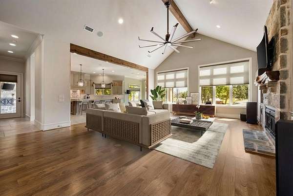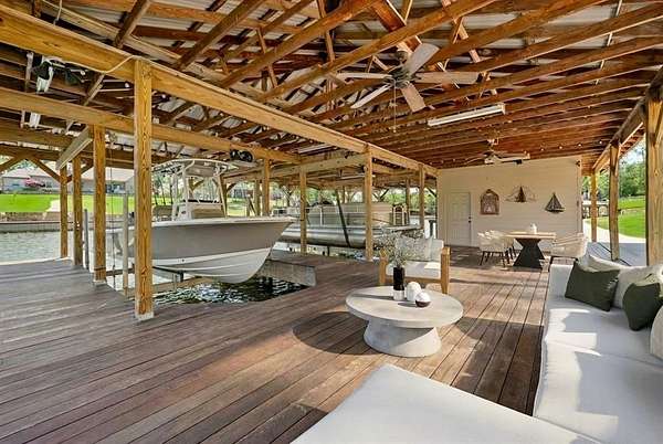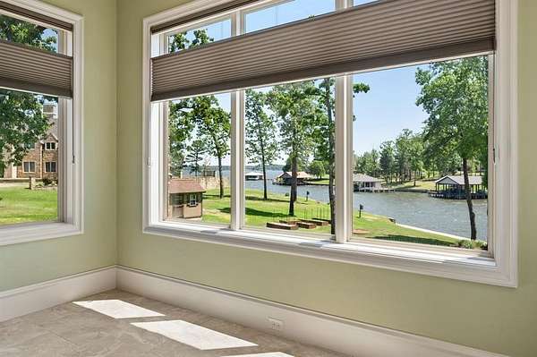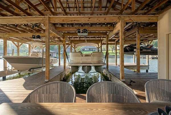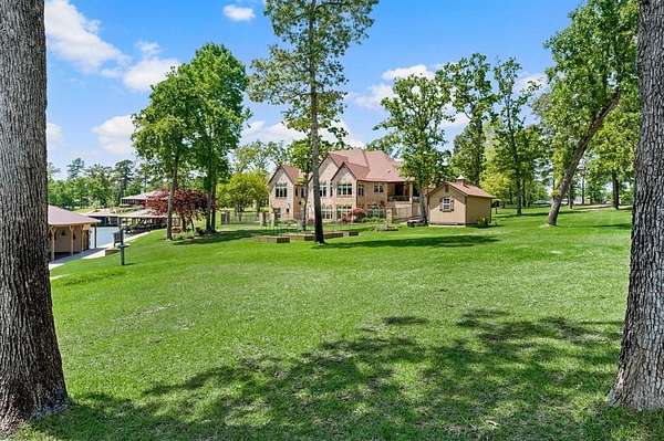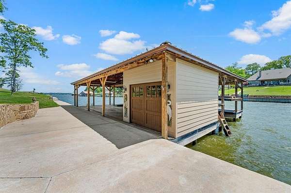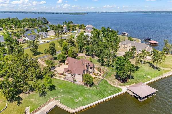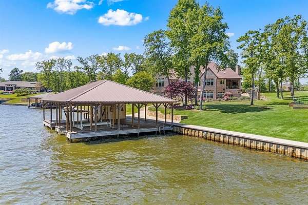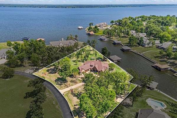 Nestled in exclusive Brown's Landing gated community on Lake Palestine, this Stunning 2.1-acre estate, with 442 ft of shoreline, invites you to dive into a lifestyle filled with sun, fun, & relaxation. Be wowed by the bright living area, soaring vaulted ceilings & cozy fireplace perfect for chilly evenings. Open layout flows beautifully into formal dining rm & gourmet kitchen featuring oversized island - ideal for whipping up delicious meals & hosting unforgettable parties! Picture sipping your morning coffee on your covered patio, warmed by wood-burning fireplace, as you soak in breathtaking sunrises over the shimmering lake. Need a cozy hangout? Versatile bonus rm with captivating views is perfect for family meals or lazy afternoons. Primary suite is a spacious sanctuary boasting impressive bathroom with coffee bar & private access to backyard. Thoughtfully designed lower level is an entertainer's dream, featuring extra living area with fireplace, game rm with pool table, bar for mixing up your favorite drinks, & media rm with updated Full Swing golf simulator for year-round fun! This home comfortably sleeps 10+ guests with 3 additional bedrms ensuring ample space for family gatherings, weekend getaways, or entertaining friends. Step outside to your lower patio & embrace blissful waterfront living with bug misting systems around the house & dock--no pesky bugs here! Your 3-stall boathouse with stunning Garapa Brazilian hardwood deck & freshwater access is ready for fishing, boating, & skiing. This extraordinary home blends luxury & comfort featuring a newly upgraded Crestron home automation system, Hickory wood flooring, Generac Whole House 36KW backup generator, & 2 buried propane tanks (1000 & 500). Visualize your new lifestyle & the endless possibilities that await with the virtually staged images, showcasing the potential of this exquisite property. Embrace the ultimate luxury retreat where years of family memories will be made. Welcome home to Lake Palestine!