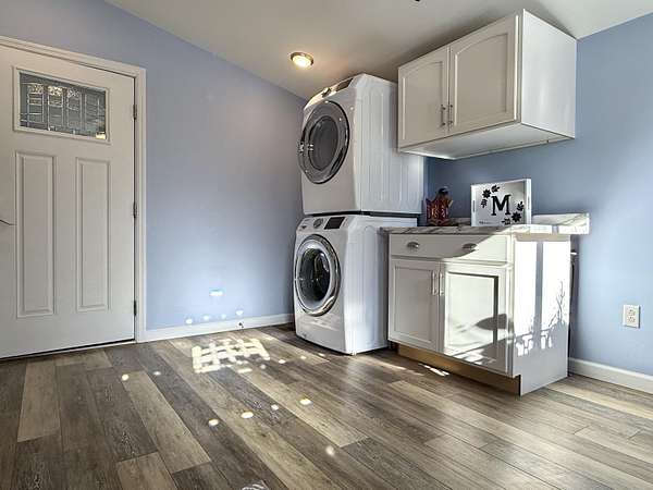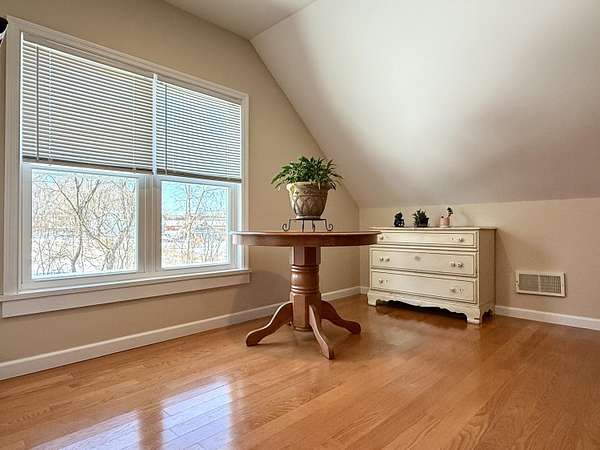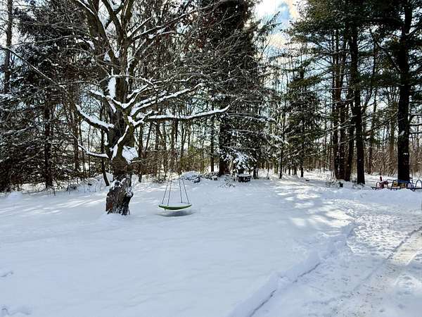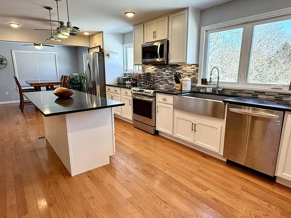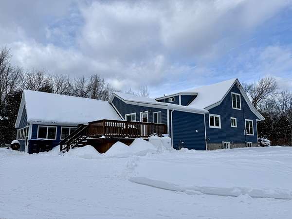 Spacious and thoughtfully updated, this 4-bedroom, 2-bath home sits on approximately 1.6 acres in a peaceful setting. Hardwood floors run throughout much of the home, enhancing the open floor plan with a natural flow from the kitchen and dining area, into the living room. The modern kitchen offers quartz countertops, stainless steel appliances, a large farmhouse sink, and a center island with breakfast bar seating. An adjacent flex space offers excellent versatility-ideal for a bar area, coffee station, or expanded kitchen storage. The oversized primary bedroom is conveniently located on the first floor and connects directly to the first floor main bathroom for ease of access. A three-season sunroom off the primary bedroom provides a relaxing retreat, complete with hot tub connections. Attractive cable railings lead to the second floor, where two additional bedrooms and a second full bath complete the layout. Additional features include a high-efficiency Lennox hot air furnace with A/C coil already installed, and backwashing carbon water filtration system. Outside, the property offers a serene atmosphere with several apple trees (mostly Honeycrisp), dual-season raspberry bushes, young blueberry bushes, and a natural spring with small pond at the rear of the property. Heated & insulated detached garage and two storage sheds round out this special property. 360 degree virtual tour can be found here: (Seller requires pre-qualification or cash proof of funds to schedule showings.)