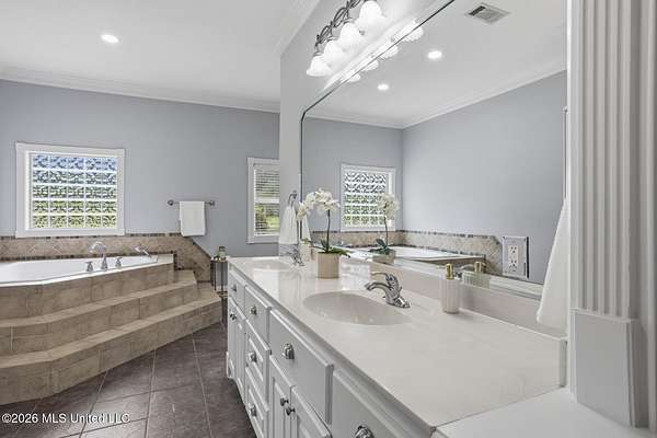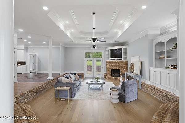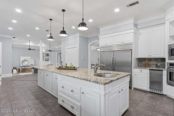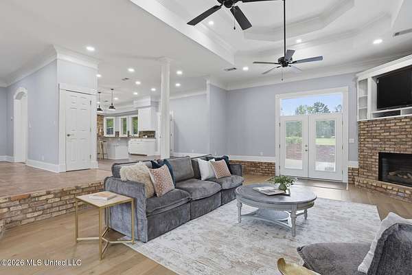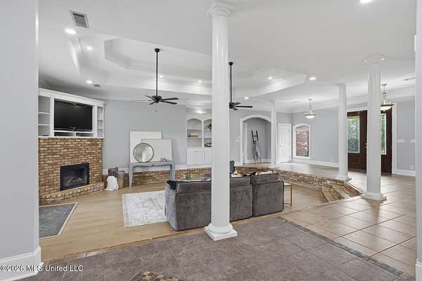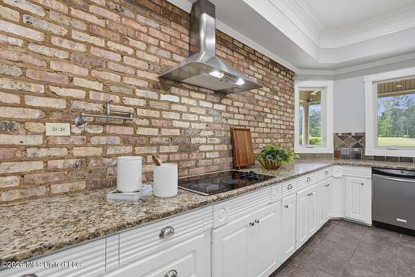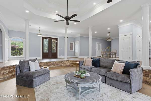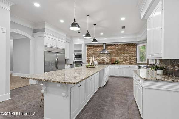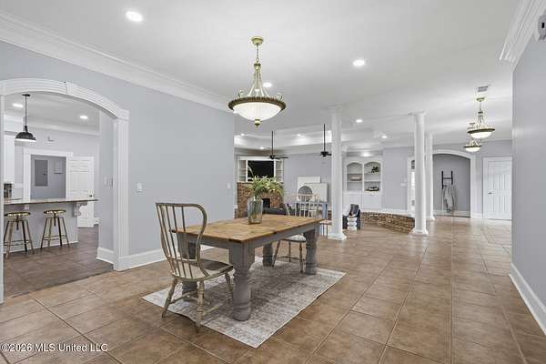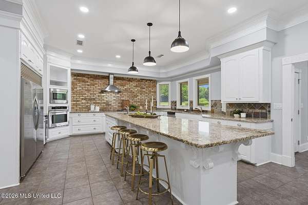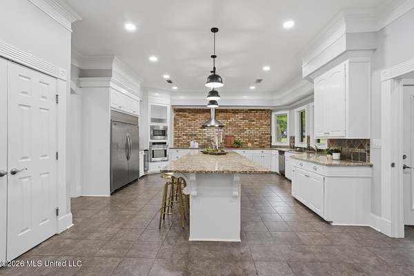 Located in a highly regarded school district in Florence, this property sits on 2 acres of land. This custom-built home offers 4,450 square feet of living space and features 4 bedrooms and 4 bathrooms. The interior layout includes a sunken great room with a gas log fireplace that flows into the kitchen. The kitchen is equipped with a 14-foot granite island, custom cabinetry, stainless steel appliances, an ice maker, a pot filler, and an oversized built-in refrigerator. A large laundry room with a sink, extra storage, and a full bathroom is conveniently located off the kitchen. The primary suite includes a double-tray ceiling and a bay window. The primary bathroom features a jetted tub, a separate shower, and a spacious walk-in closet. Two additional oversized bedrooms share a hall bathroom on the main level. The upstairs level features a flexible bedroom or bonus room that includes a private full bathroom, ideal for guests or a home office. The exterior features Chicago brick construction, grand entrance columns, and a 3-car garage. Outdoor living space includes two patios, one of which is equipped with a built-in brick grill and an outdoor fireplace. The home has been recently painted and updated with new light fixtures. It is in move-in condition. Please contact your real estate agent to arrange a showing.