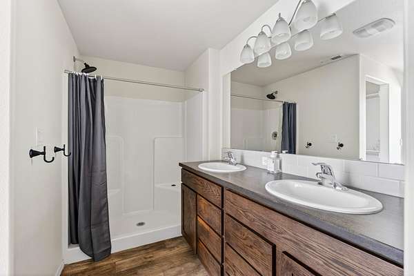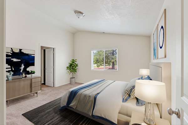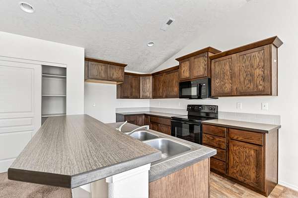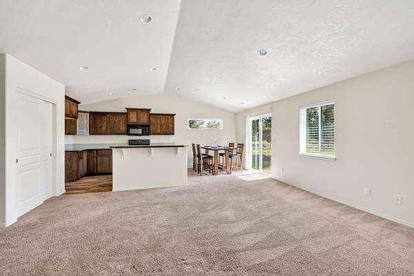 - Breakfast Bar, Enclosed Toilet(s), Fiberglass Stall Shower, Kitchen Island, Pantry, Primary Downstairs, Shower/Tub Combo, Vaulted Ceiling(s), Walk-In Closet(s)
