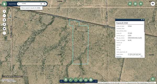 Est $422/mo56 beautiful acres with easy road access off of Highway 62/180. Located near Cornudas, TX with 360 views around. This area is perfect for your off-grid homestead. Most properties in the area utilize hauled water from nearby Dell City, septic tanks, solar panels and propane. Only an hour drive from El Paso, and 30 minutes to Dell City. Electricity is close by but not on property yet. Wildlife are all over this area, watch for antelope and more. Fiber optic cable from AT&T on property. Photo and boundaries are approximate based off of county mapping.