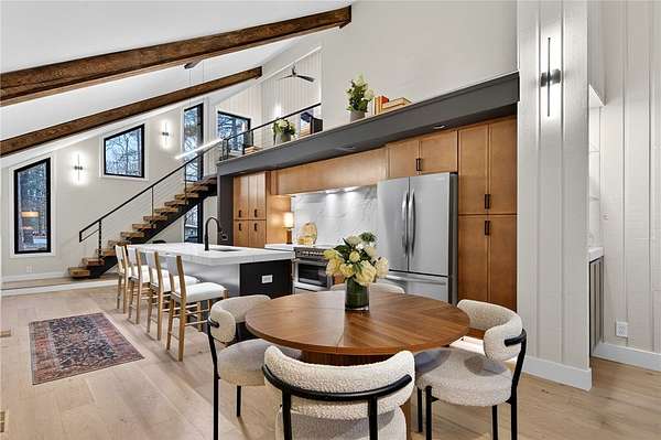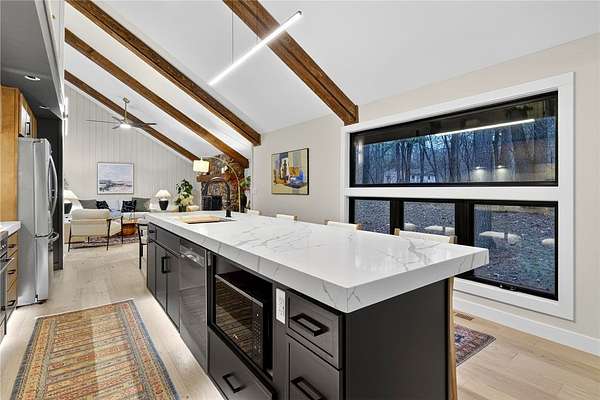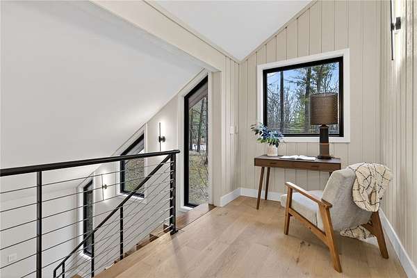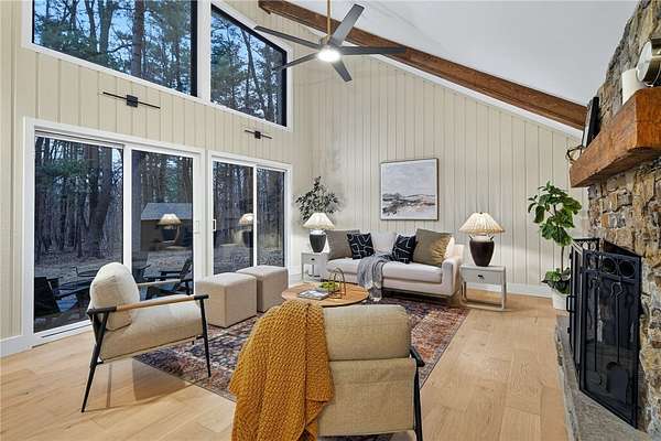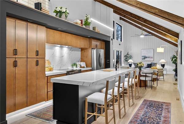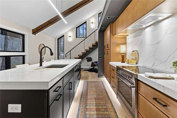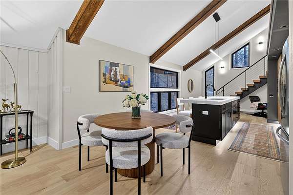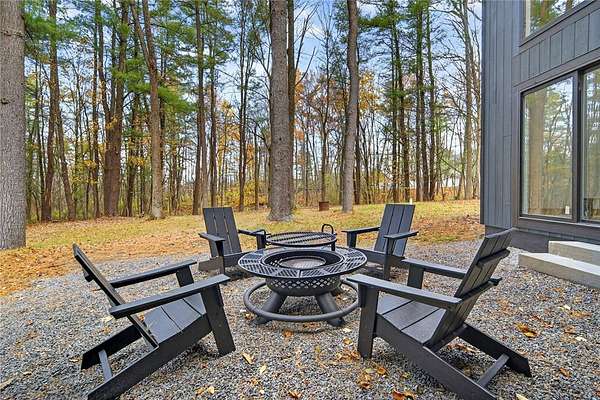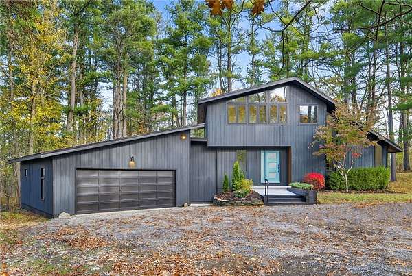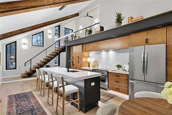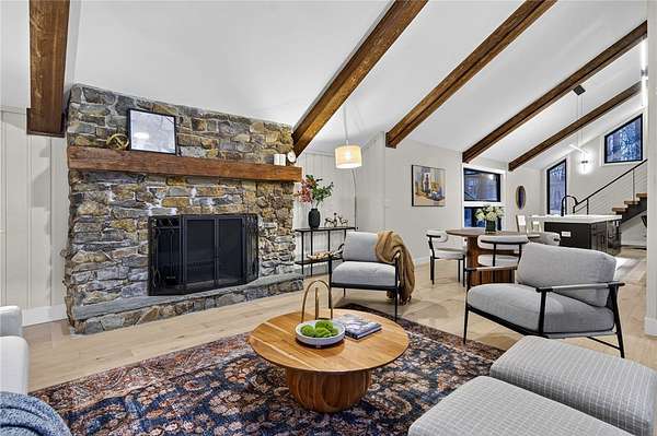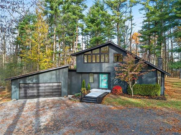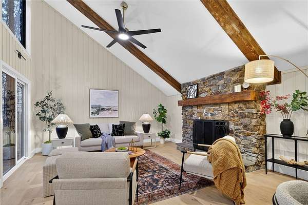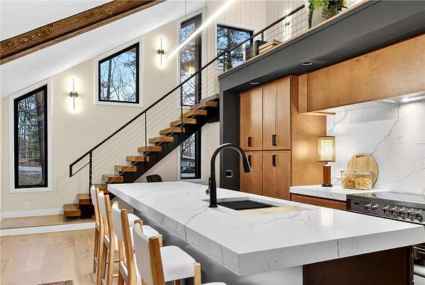 Contemporary, "like new" homes in Ithaca are exceptionally rare and this one is truly spectacular. Completely gutted and professionally renovated from top to bottom, it offers the freshness of new construction with the warmth and character buyers crave. Set on a private 2 acre, wooded lot with a babbling brook, the setting is peaceful, scenic, and surprisingly convenient. South facing exposure fills the home with beautiful natural light, enhanced by dramatic triangular gable windows and soaring spaces that make every room feel bright and architectural. At the heart of the home is a stunning kitchen designed for both everyday living and entertaining, featuring solid maple cabinetry with pull out drawers, a deep sink with smart accessories, and 3" thick quartz counters. The 10' X 6' oversized island is a true showpiece, large enough for a chef to prep and cook comfortably, with plenty of seating for gathering. Spectacular lighting above and below the cabinetry adds a beautiful glow and enhances the warmth and spaciousness of the space. The open floor plan flows seamlessly from the kitchen to the dining area and living room, where beamed ceilings, white oak floors, and an original stone fireplace with a rustic mantel create the perfect blend of modern style and timeless texture. Sliding glass doors extend the living space outdoors to a private back patio, ideal for dining, relaxing, and enjoying evenings by the firepit with the brook nearby. The main floor primary suite is a dream with a walk in closet and a show stopping bath featuring a dual vanity and an oversized walk in shower. A stylish powder room, functional mudroom, and oversized 2 car garage complete the first floor. Upstairs, a striking floating staircase leads to three additional bedrooms and a full bath, perfect for guests, office space, or flexible living. Located on a quiet street just minutes to Cornell, downtown Ithaca, and the airport, this is a rare opportunity to own a like new contemporary home with true mid century modern flair. An additional adjacent 2 acre lot is also available, along with personalized upgrade options such as a deck or stone patio for the discerning buyer.