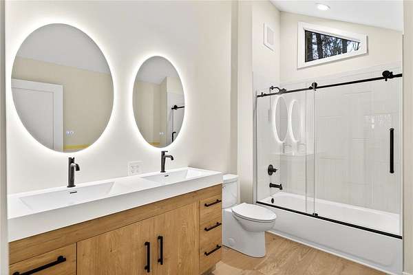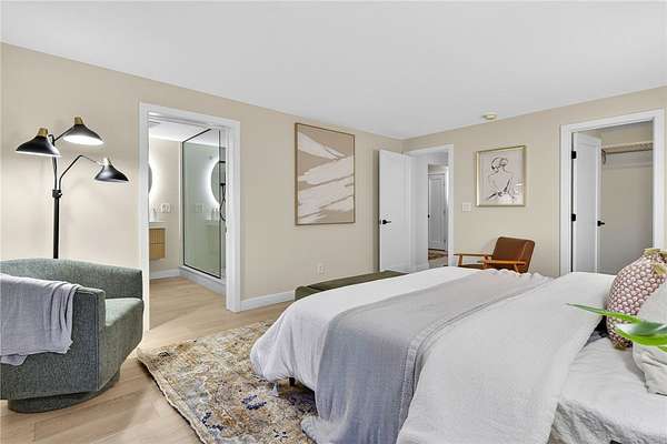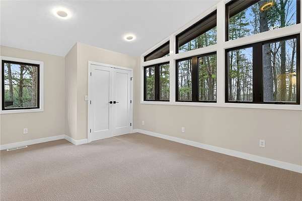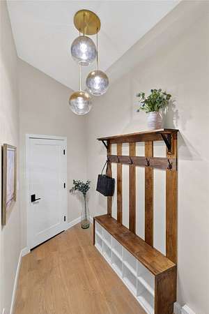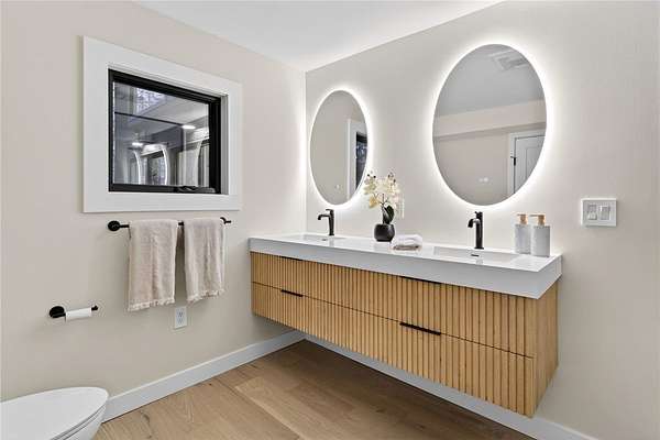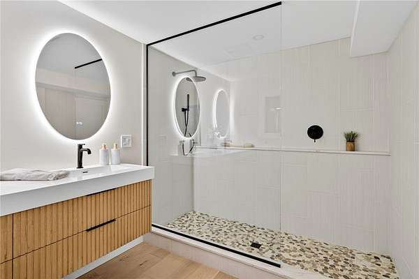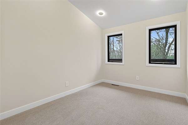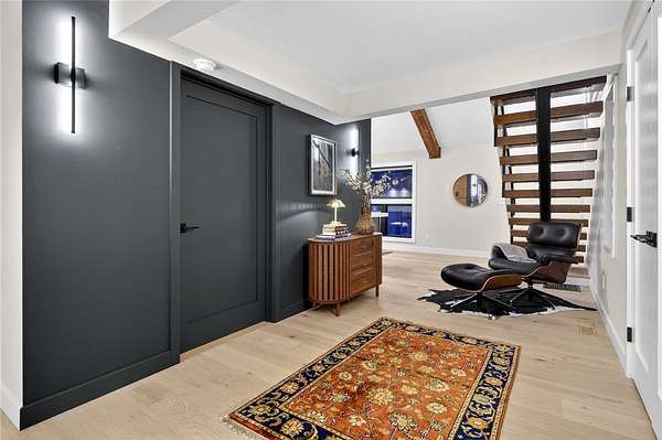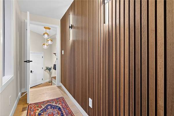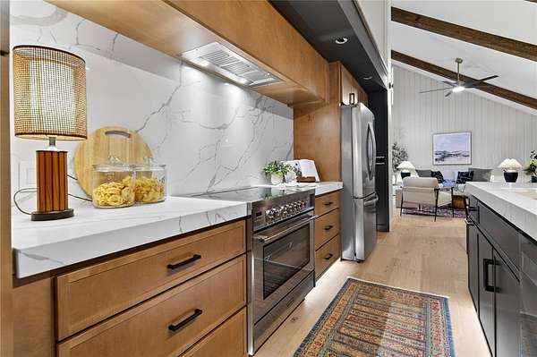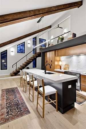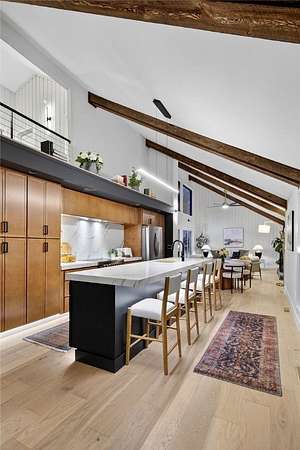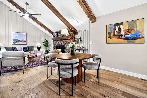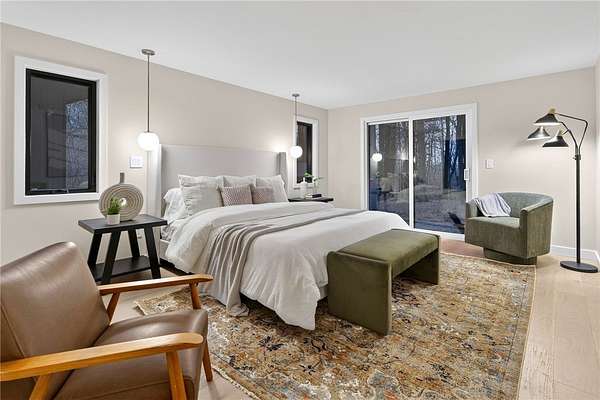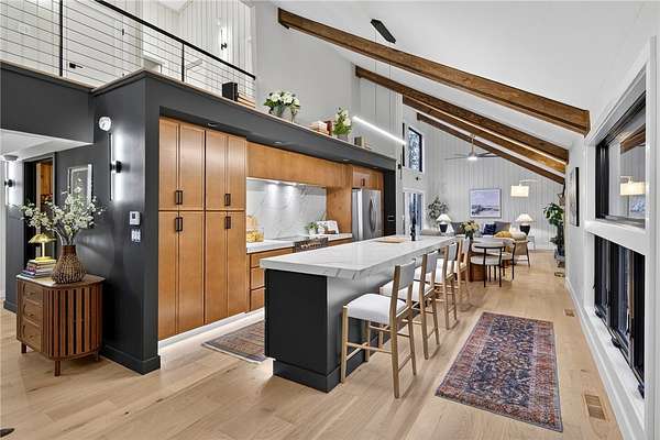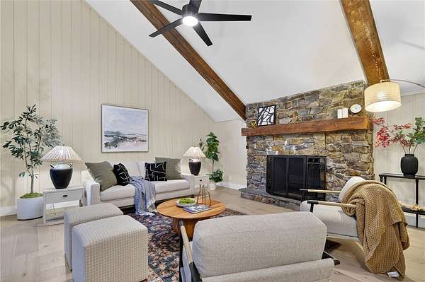 Contemporary, "like new" homes in Ithaca are exceptionally rare and this one is truly spectacular. Completely gutted and professionally renovated from top to bottom, it offers the freshness of new construction with the warmth and character buyers crave. Set on a private 2 acre, wooded lot with a babbling brook, the setting is peaceful, scenic, and surprisingly convenient. South facing exposure fills the home with beautiful natural light, enhanced by dramatic triangular gable windows and soaring spaces that make every room feel bright and architectural. At the heart of the home is a stunning kitchen designed for both everyday living and entertaining, featuring solid maple cabinetry with pull out drawers, a deep sink with smart accessories, and 3" thick quartz counters. The 10' X 6' oversized island is a true showpiece, large enough for a chef to prep and cook comfortably, with plenty of seating for gathering. Spectacular lighting above and below the cabinetry adds a beautiful glow and enhances the warmth and spaciousness of the space. The open floor plan flows seamlessly from the kitchen to the dining area and living room, where beamed ceilings, white oak floors, and an original stone fireplace with a rustic mantel create the perfect blend of modern style and timeless texture. Sliding glass doors extend the living space outdoors to a private back patio, ideal for dining, relaxing, and enjoying evenings by the firepit with the brook nearby. The main floor primary suite is a dream with a walk in closet and a show stopping bath featuring a dual vanity and an oversized walk in shower. A stylish powder room, functional mudroom, and oversized 2 car garage complete the first floor. Upstairs, a striking floating staircase leads to three additional bedrooms and a full bath, perfect for guests, office space, or flexible living. Located on a quiet street just minutes to Cornell, downtown Ithaca, and the airport, this is a rare opportunity to own a like new contemporary home with true mid century modern flair. An additional adjacent 2 acre lot is also available, along with personalized upgrade options such as a deck or stone patio for the discerning buyer.