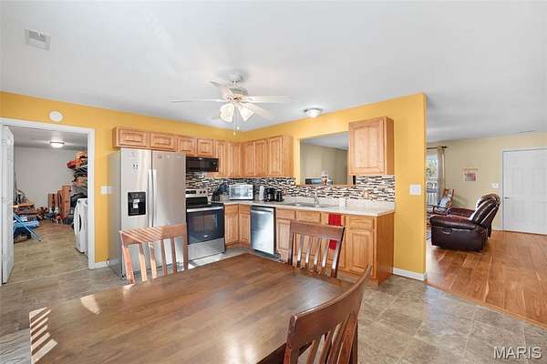 Inside, the warmth continues. The inviting living room features a cozy wood-burning stove, perfect for chilly winter mornings. The eat-in kitchen blends charm and function, showcasing stainless steel appliances, a tasteful tile backsplash, and plenty of cabinet space for everyday living. Down the hall, the primary suite offers privacy with its own full bath, while two additional bedrooms share another conveniently located bathroom -- ideal for family or guests.
