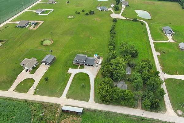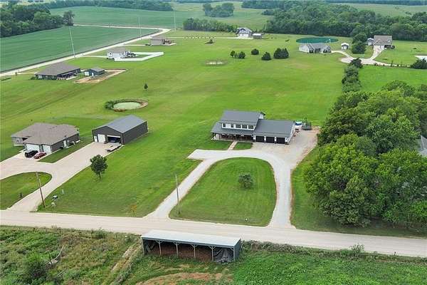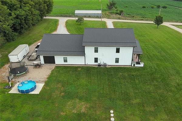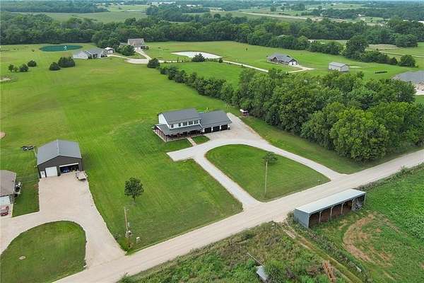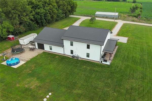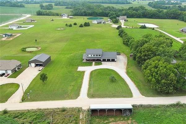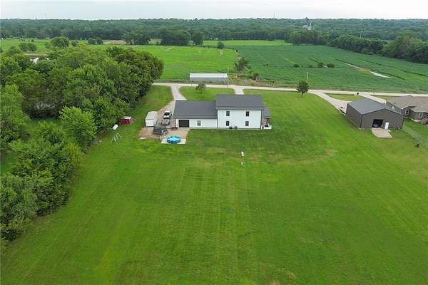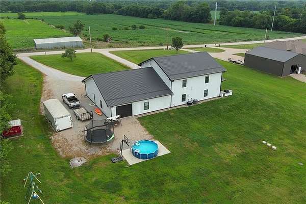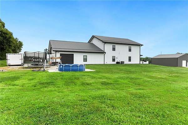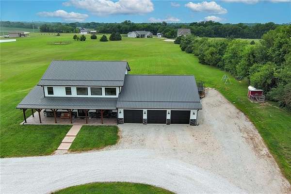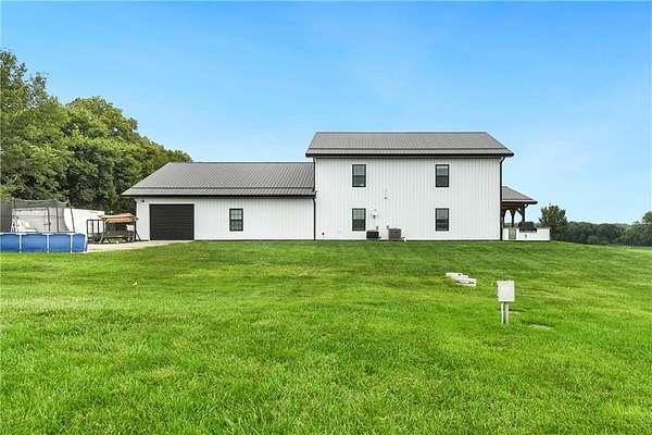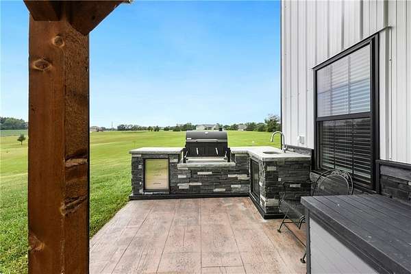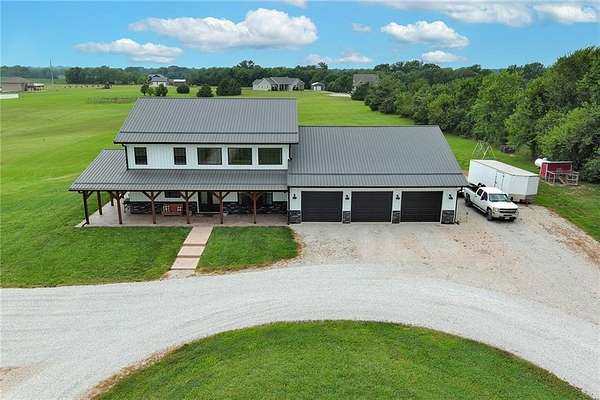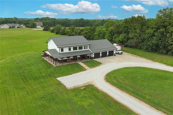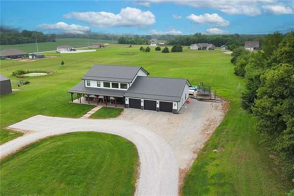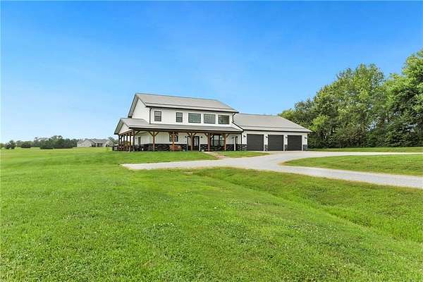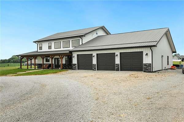 Big Beautiful Almost new Barndominium 5bedroom home in a rural setting, but only .3 mile south of 50 hwy access. Home on 3+ acre lot, Circle driveway to the Huge 3-door garage with 2 tandem bays, 1 bay has drive through door and garage has a full bathroom, 8'x8' concrete Storm shelter/storage area and a 2nd washer/dryer hookup. Brand new stacked stone outdoor kitchen to assist with entertaining on the stamped concrete wrap around patio/porch. Double front door entry to 18' cathedral ceiling living room with fireplace and great natural lighting. Large kitchen with 8x5 island, custom cabinets, stainless appliances and step in pantry. Huge eat-in dining area with atrium doors to access the outdoor kitchen. 2 rooms on main floor that can be 4th and 5th bedrooms, but are currently utilized as a playroom and office. Main floor also has a full bathroom and a large mudroom. Upstairs has Primary master suite with walk in closet and room for sitting area. Upstairs has bedroom 2 & 3 with large closets and they share a full bath. Upstairs laundry is central to main bedrooms. Lots of beautiful touches and upgrades to this custom home... Energy efficient, has water softener, 2x6 framing with R24 insulation, R10 floor insulation, R44 ceiling insulation, and more. This gorgeous home has Centerview address, Warrensburg schools.