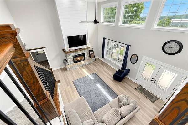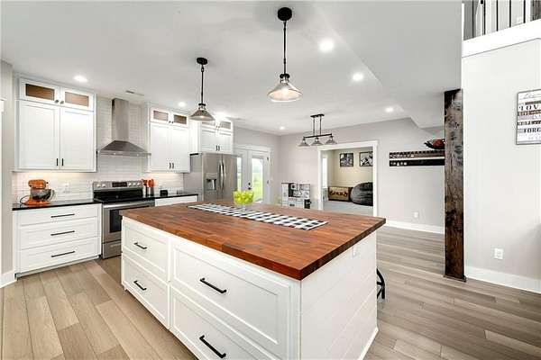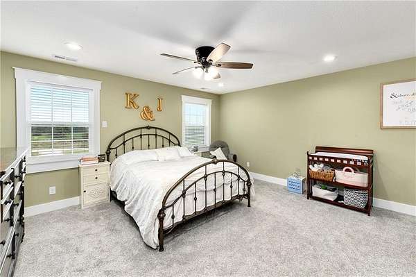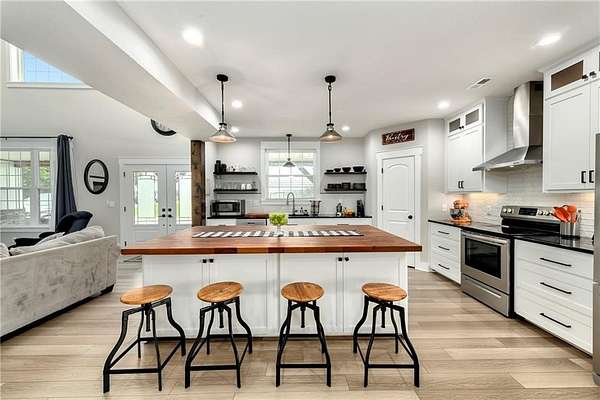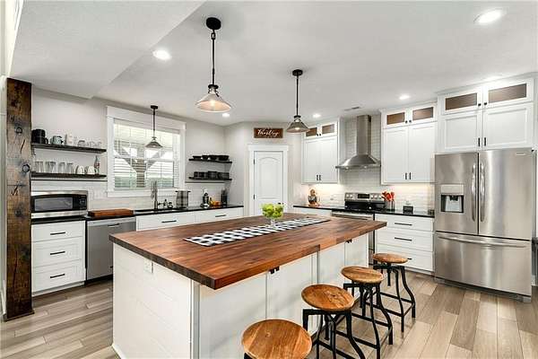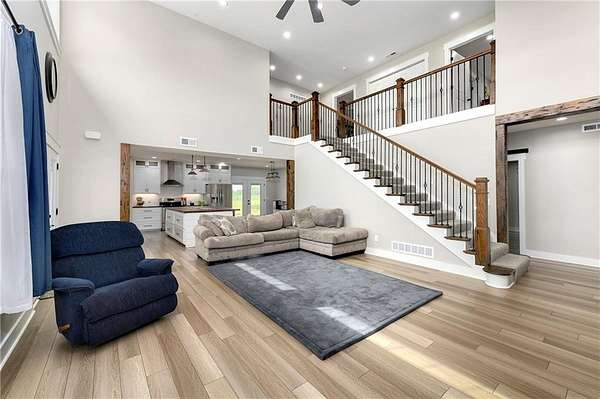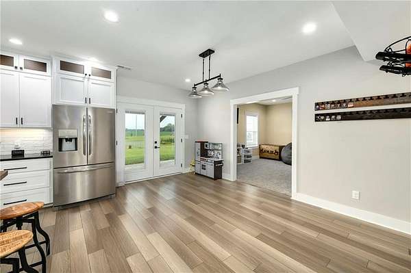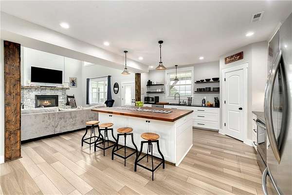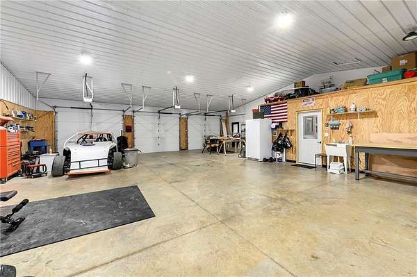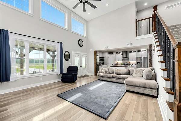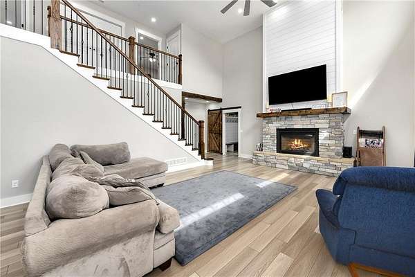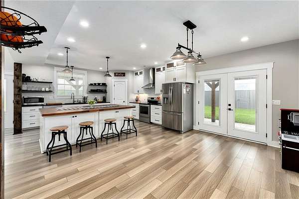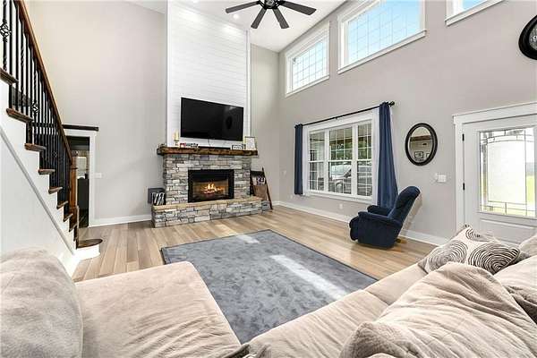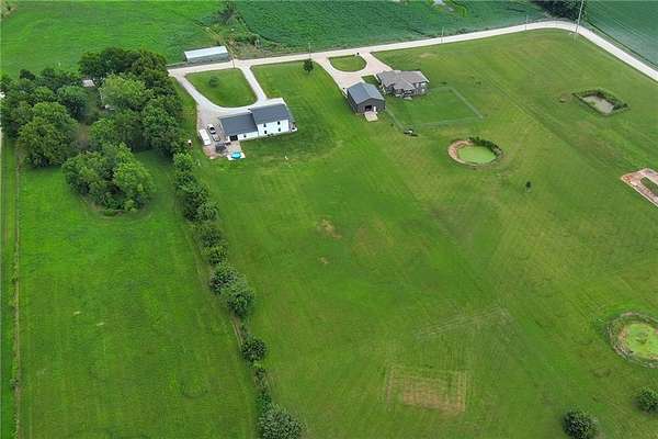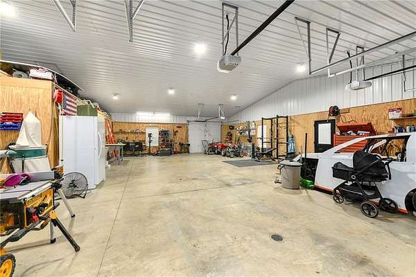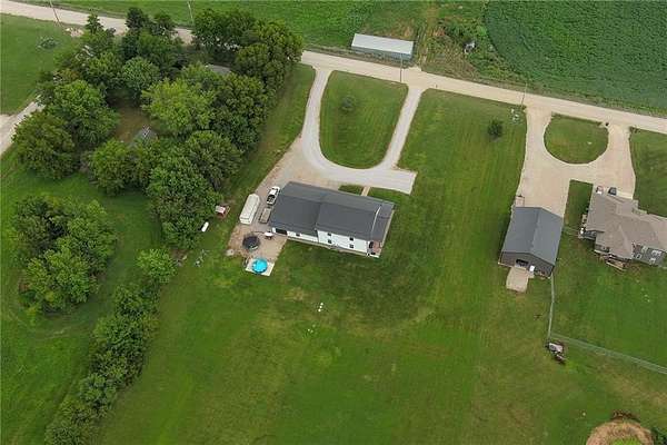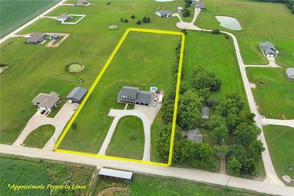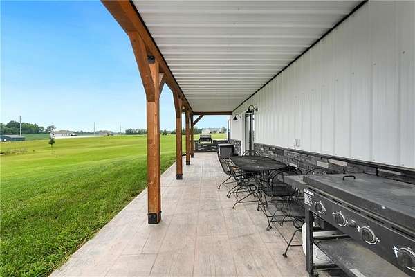 Big Beautiful Almost new Barndominium 5bedroom home in a rural setting, but only .3 mile south of 50 hwy access. Home on 3+ acre lot, Circle driveway to the Huge 3-door garage with 2 tandem bays, 1 bay has drive through door and garage has a full bathroom, 8'x8' concrete Storm shelter/storage area and a 2nd washer/dryer hookup. Brand new stacked stone outdoor kitchen to assist with entertaining on the stamped concrete wrap around patio/porch. Double front door entry to 18' cathedral ceiling living room with fireplace and great natural lighting. Large kitchen with 8x5 island, custom cabinets, stainless appliances and step in pantry. Huge eat-in dining area with atrium doors to access the outdoor kitchen. 2 rooms on main floor that can be 4th and 5th bedrooms, but are currently utilized as a playroom and office. Main floor also has a full bathroom and a large mudroom. Upstairs has Primary master suite with walk in closet and room for sitting area. Upstairs has bedroom 2 & 3 with large closets and they share a full bath. Upstairs laundry is central to main bedrooms. Lots of beautiful touches and upgrades to this custom home... Energy efficient, has water softener, 2x6 framing with R24 insulation, R10 floor insulation, R44 ceiling insulation, and more. This gorgeous home has Centerview address, Warrensburg schools.