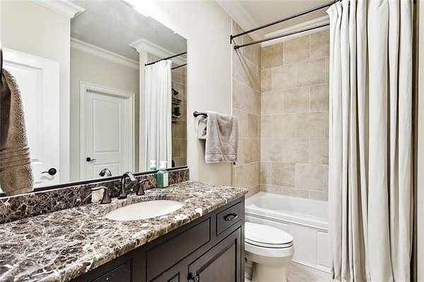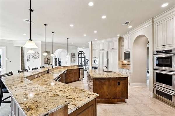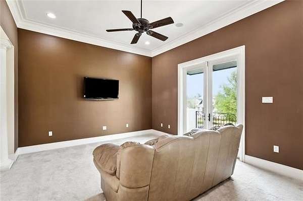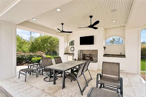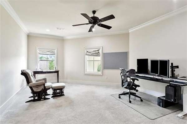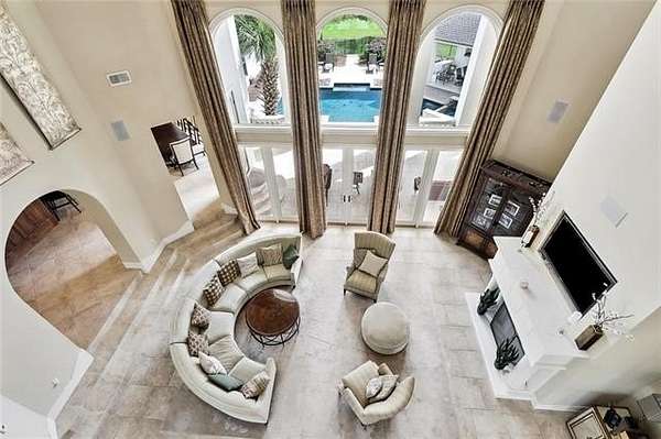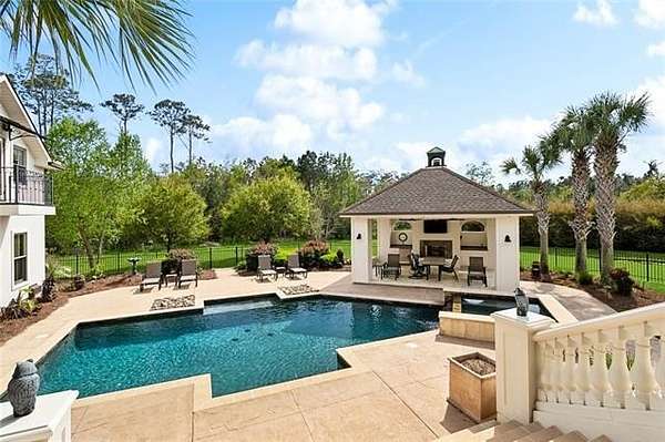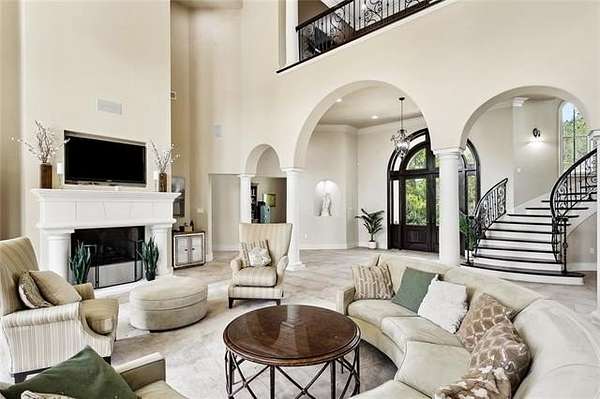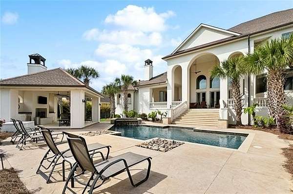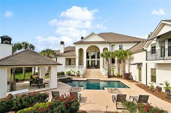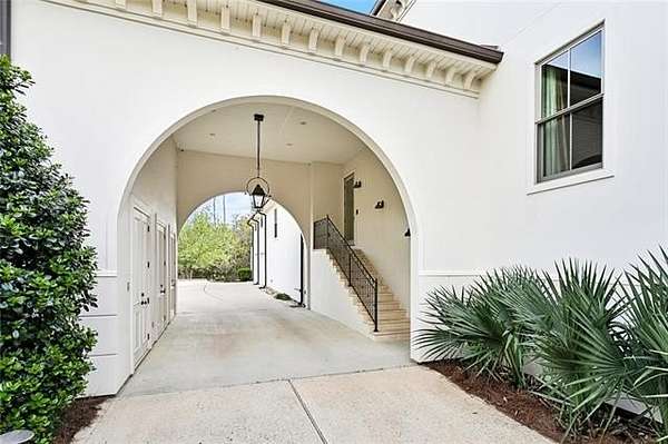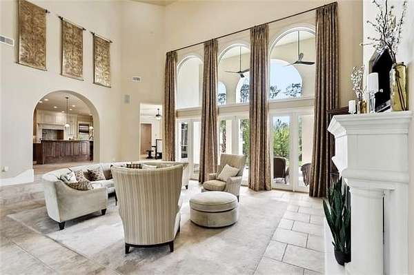 This impressive custom estate sits on a 1.69 acre homesite in Mandeville's premier luxury community, The Sanctuary, and incorporates dramatic Mediterranean-inspired design elements to create bold and unique front and rear facades. The over-sized arched entryway, the impressive spiral staircase of the great room and its 26' soaring ceiling anchors the first floor, which is flanked by the master suite, and the dining, kitchen and breakfast rooms. The enormous kitchen boasts a center prep island with an additional wrap-around counter with seating, a large breakfast room, and a butler pantry that connects to the formal dining room featuring its own balcony overlooking the front of the property. The first floor is also home to a guest suite and a home theater room that can also function as a very spacious home office suite.