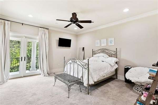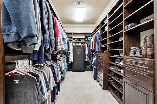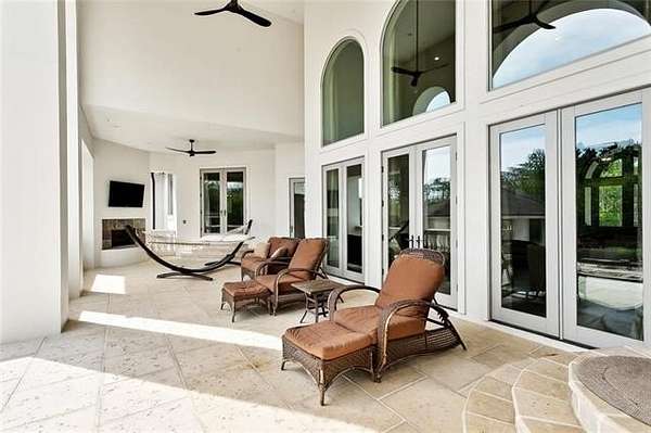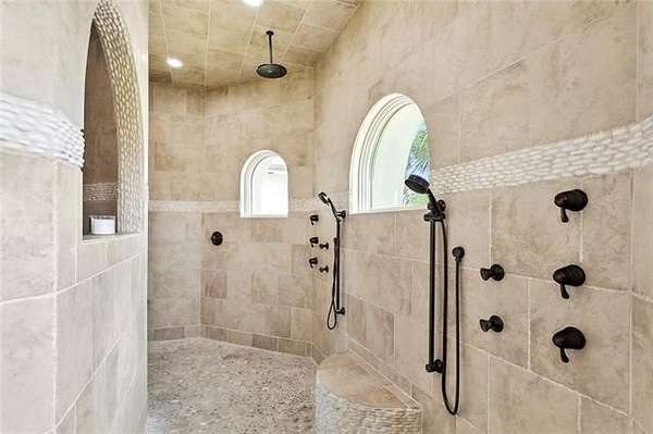 The master suite bedroom overlooks the backyard and pool and is large enough to accommodate a full compliment of furniture. There is an exercise room, 380 sf closet, and the bathroom has two vanities, a make-up station, jetted tub, and a 20' walk-through shower. The second floor features a sitting room that overlooks the great room and pool, and three ensuite bedrooms.