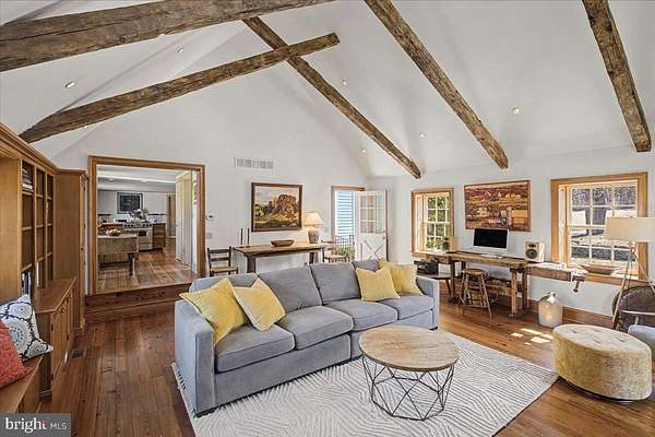 Legacy-quality country retreat with bespoke craftsmanship, reclaimed wood, and serene River Valley surroundings, ideal as a sophisticated primary residence or a refined weekend escape. This is a house with pedigree, designed by the late distinguished Princeton architect, William M. Thomson, whose Williamsburg, Virginia roots greatly influenced its style. Mr. Thompson and a team of master builders crafted the stunning four bedroom home using reclaimed lumber from local architectural salvage. The magnificent hand-hewn beams that grace the vaulted ceilings are hundreds of years old, and the floors crafted from 300 year old long leaf pine beams, known for its beauty and tight grain. Every detail has been meticulously curated, from the elegant moldings and custom doors to the three beautiful constructed fireplaces. This home has excellent flow and natural light, enhanced by a spacious finished walk out basement featuring a wine cellar and billiards media room. The three car garage is an architectural gem, beautifully designed with cedar lined interior. The upper dormers create a magical light filled second floor space brimming with possibilities. Nestled in a park like setting, this property is surrounded by nature on one of Delaware Township's most cherished roads. Strimples Mill Road is celebrated for its enchanting historic fieldstone walls, built by the area's first European settlers. Proximity to the Lockatong Wildlife Management Area offers gorgeous hiking trails, birdwatching, and swimming opportunities. Just minutes from the Delaware river and towpath, this home is ideal for those with an active lifestyle. Hiking, jogging, swimming, kayaking, fishing, and cycling are minutes away. On weekends enjoy event events at the Federal Twist Winery, located just a couple of miles away. Close to vibrant river towns, just a short drive to Stockton, New Hope, and Lambertville - each filled with restaurants, art, shops, and theaters. Only 1 1/2 hours from New York City and 55 minutes to Philadelphia, this is a perfect blend of serene living and city accessibility.