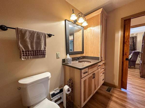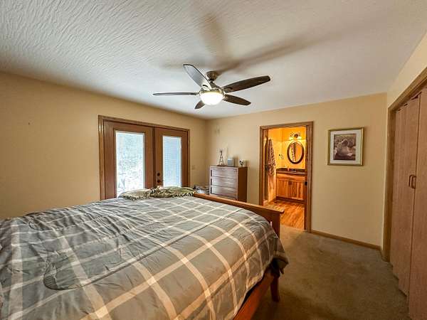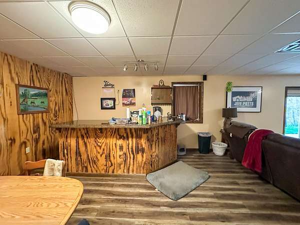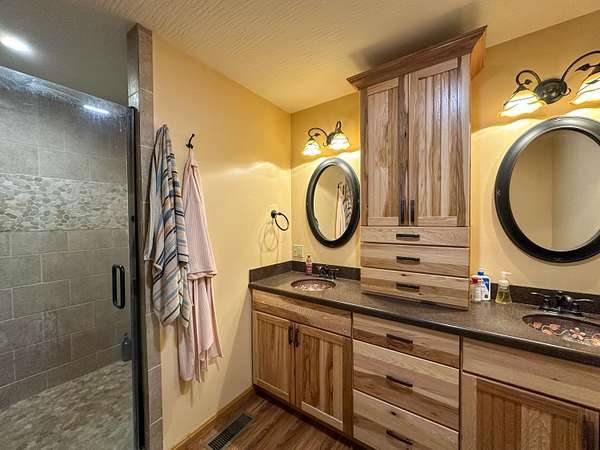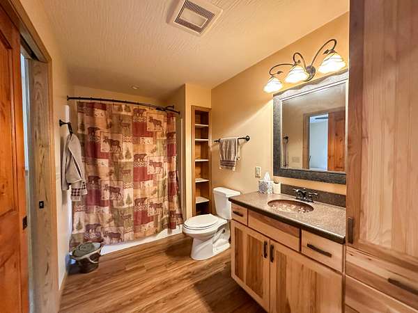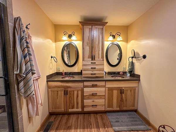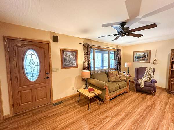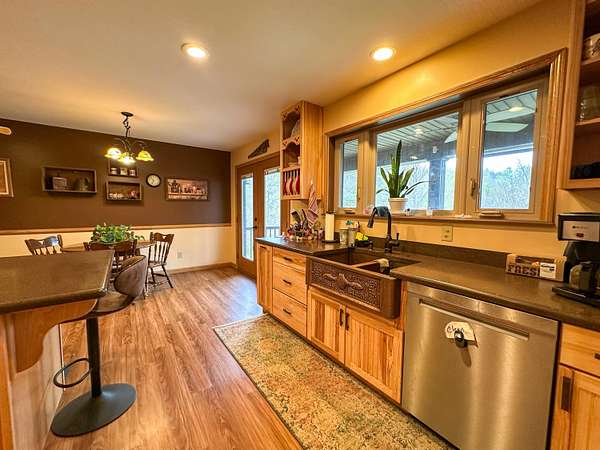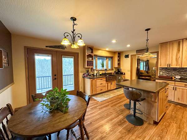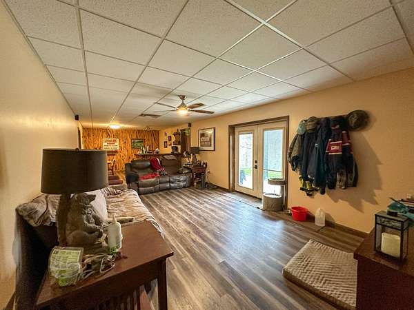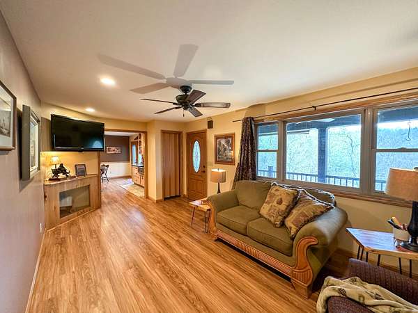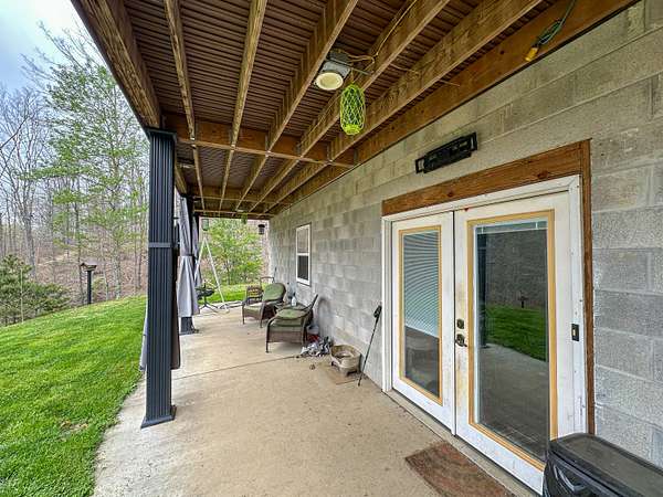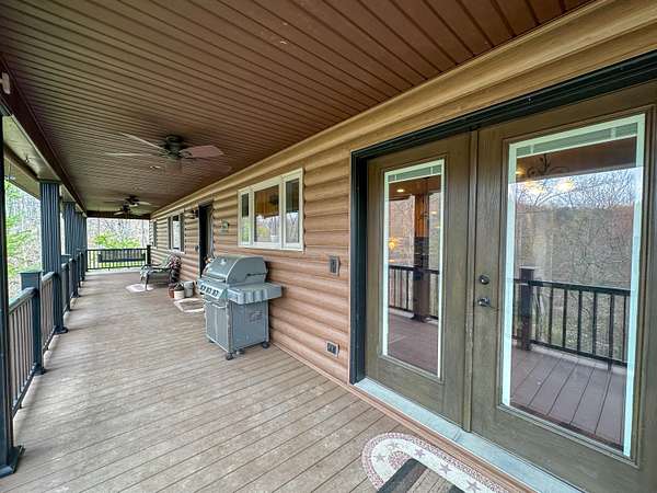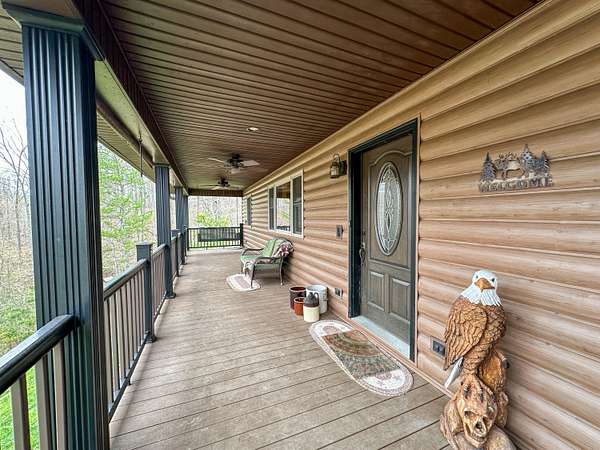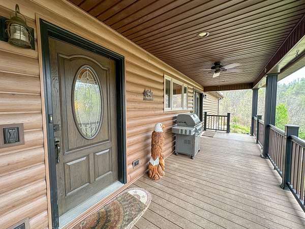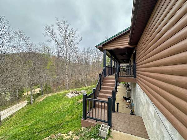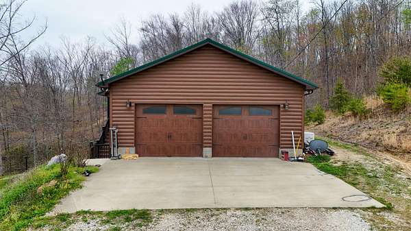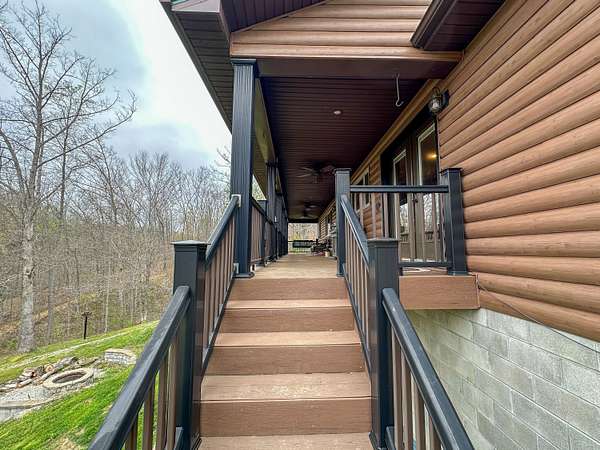 Privately situated on 55 stunning acres in Carter County, this log-sided retreat delivers quality craftsmanship and true Kentucky country living. The full-length covered porch with composite decking and ceiling fans sets the tone the moment you arrive, with wooded views and a stone fire pit yard that make outdoor living effortless. On the first floor, the kitchen impresses with custom hickory cabinetry, granite-look countertops, a tile backsplash, stainless appliances, center island, and a hand-hammered copper farmhouse sink. The living room features warm LVP flooring and a decorative glass entry door, while the primary suite offers French door porch access and a spa-like en suite with dual copper vessel sinks, custom hickory vanities, and a stunning river rock tile shower. Three additional bedrooms, a matching log-sided attached two-car garage, finished basement, and a second septic already in place for an ADU round out this exceptional offering. Trail-laced timber, long-range views, and total privacy complete the picture - properties like this don't come along often.