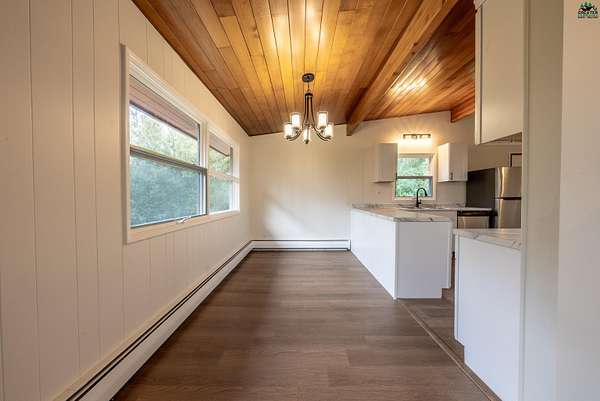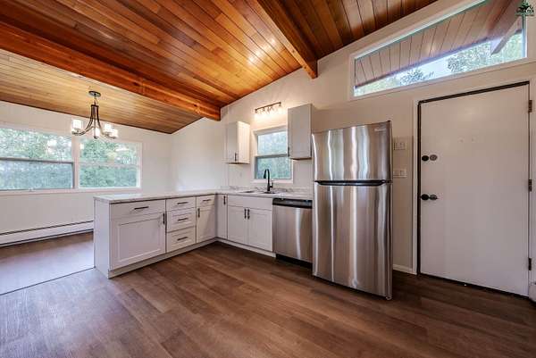 Remodeled hillside home with in-law suite just minutes from Ft. Wainwright and downtown Fairbanks. Home sits on 4 acres with commanding city and mountain views. The primary residence includes a well-appointed layout, plus a versatile mother-in-law apartment for guests, or versatile rental income. This thoughtfully updated property features vaulted ceilings, an open and bright main living area, and a chef-ready kitchen with brand new, modern appliances. The primary residence includes a well-appointed layout, plus a versatile mother-in-law apartment for guests, an in-law suite, or versatile rental income. A two-car garage and a spacious back deck provide excellent outdoor entertaining space, while the 4-acre lot offers ample room for hobbies, privacy, or future expansion. Located in a desirable hillside setting, this home combines serene views with convenient access to nearby amenities. The home features energy efficient upgrades such as a new boiler and Alaska Windows.