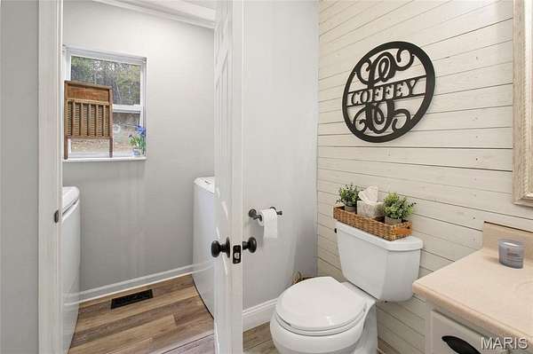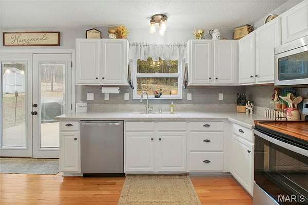 Nestled on over 2 wooded acres, this 3 bedroom, 4 bath, 1.5 story home offers privacy, usable land, and a finished walkout basement. Step in from the covered front porch to a spacious living room that leads to the eat in kitchen with solid surface countertops, a new stove (2026), and refrigerator that stays. French doors open to the fenced backyard and patio with wooded views and added privacy.