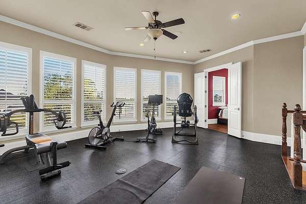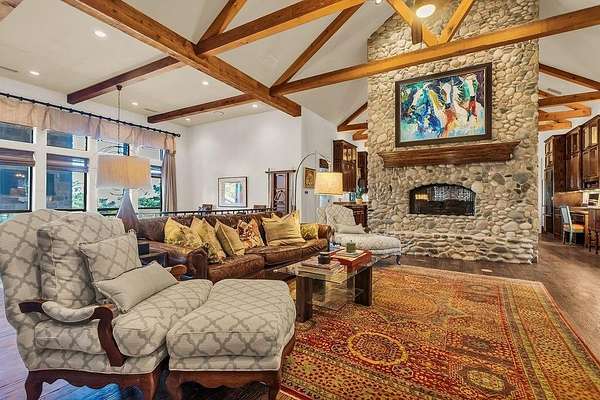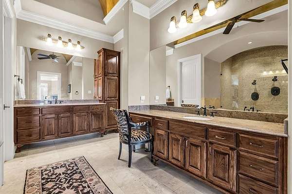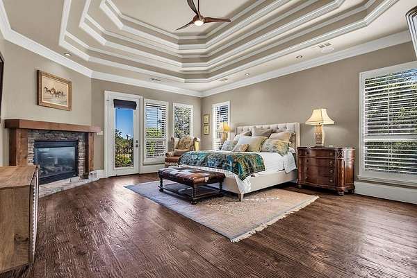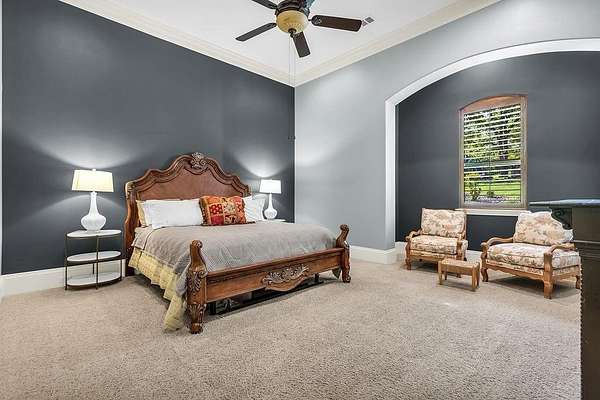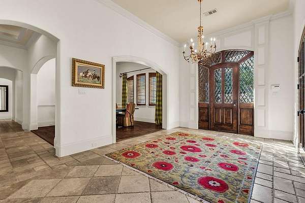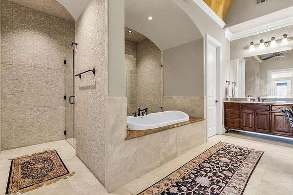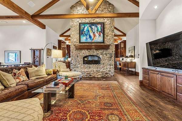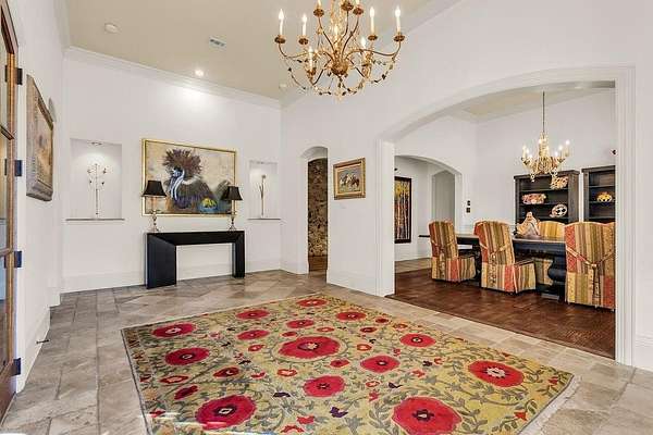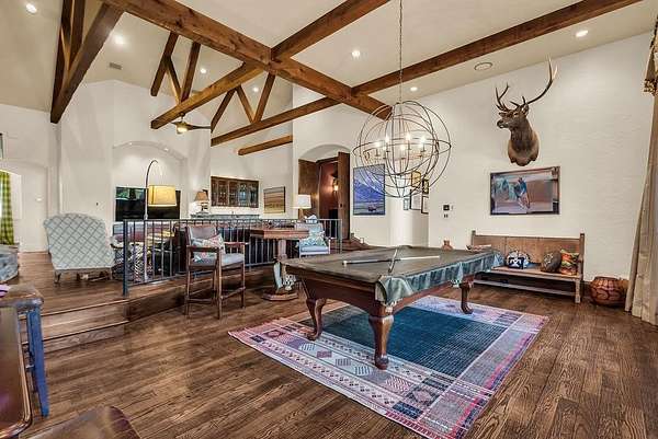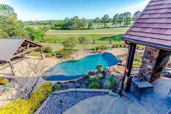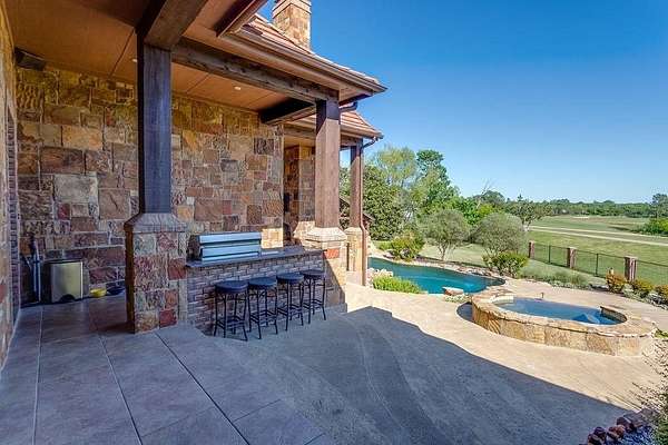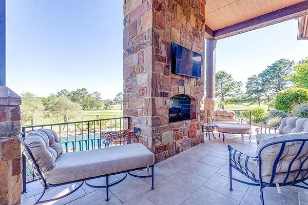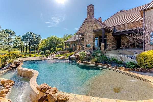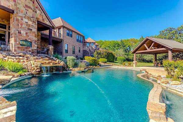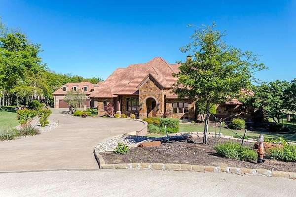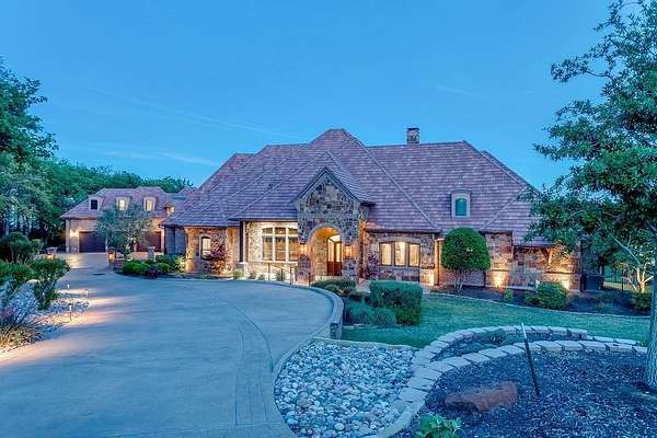 The perfect marriage of rustic warmth and refined elegance, this exceptional cul-de-sac estate sits on nearly two acres, backing to the golf course with sweeping, scenic views. Designed for both everyday living and unforgettable entertaining, the resort-style backyard features an infinity-edge pool with dramatic rock waterfall elements, all surrounded by lush, manicured landscaping that creates a true private retreat within this exclusive 24-7 guarded and gated community. Inside, the home offers a fabulous layout with the majority of bedrooms on the main level. Upstairs, a private suite off the bonus room opens to a balcony with breathtaking views, creating the perfect escape for guests or multigenerational living. A separate guest apartment with its own entrance, kitchenette, and comfortable accommodations serves as a fifth bedroom and offers ultimate flexibility. Entertainment is effortless with media and game rooms conveniently located on the main floor. Car enthusiasts will appreciate the six-car garage and expansive motor court with a remote-controlled gate. Even the details have been elevated, including a heated and cooled 17-foot dog kennel in the garage and a dedicated dog wash station in the utility room. Located in award-winning Argyle ISD and just minutes from DFW Airport, this property offers a rare combination of privacy and accessibility. For those seeking a property that exceeds their expectations, this is the one.