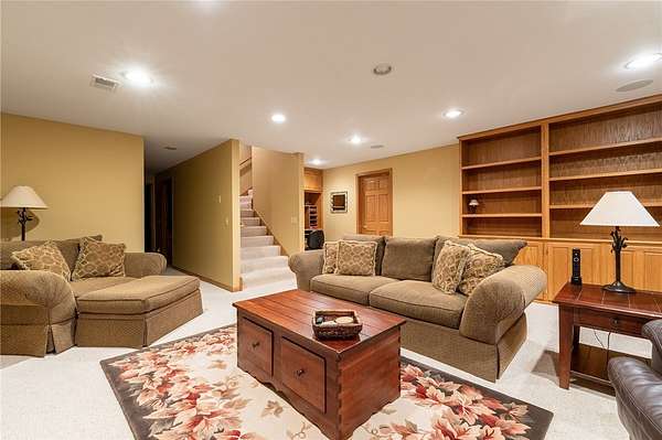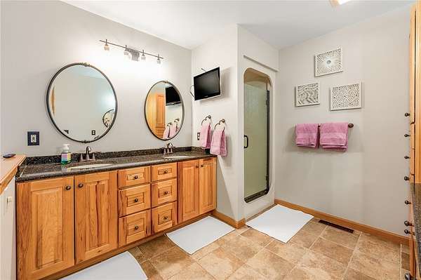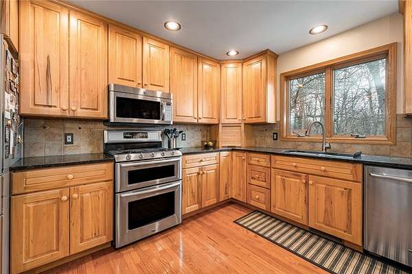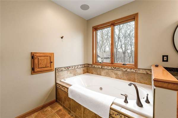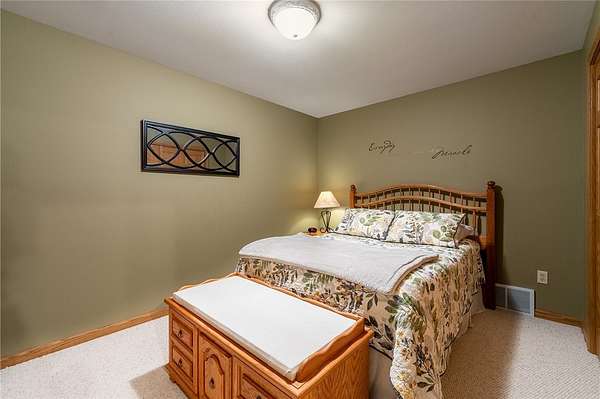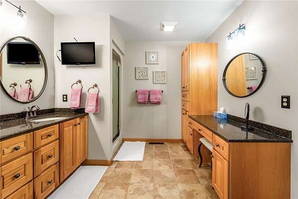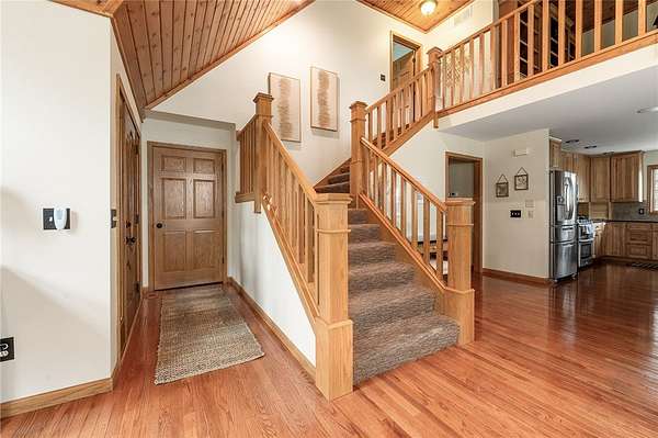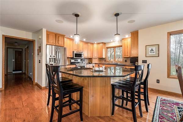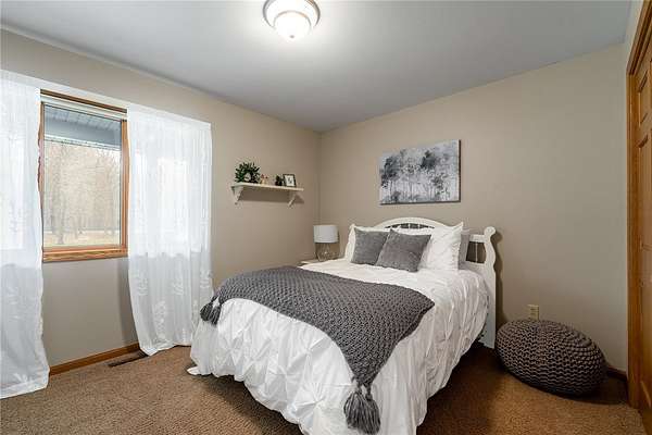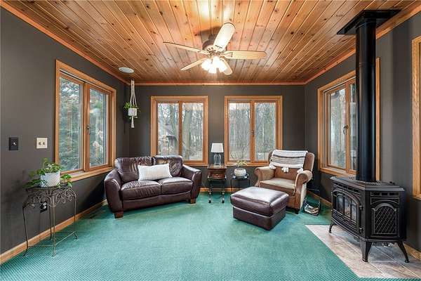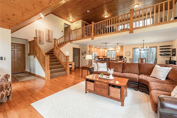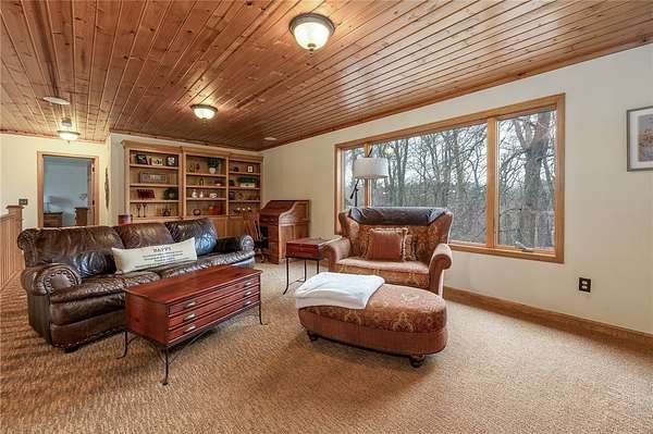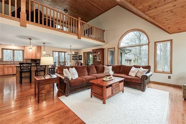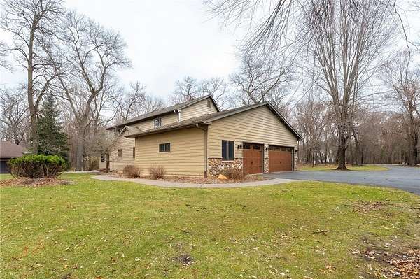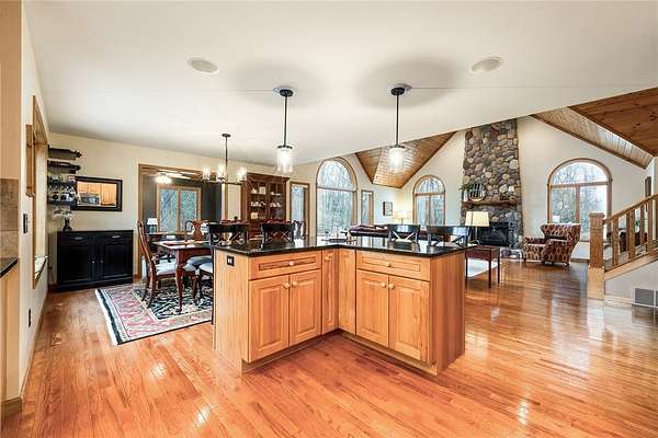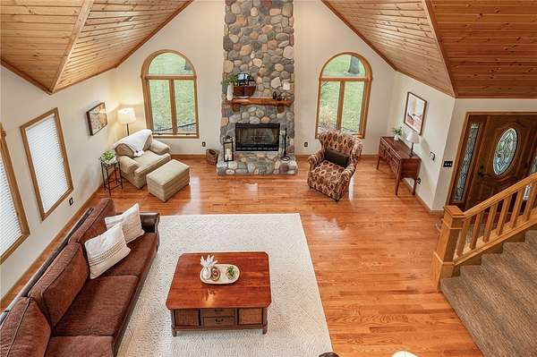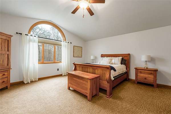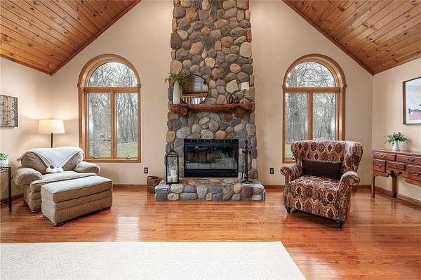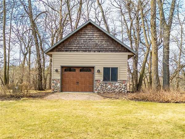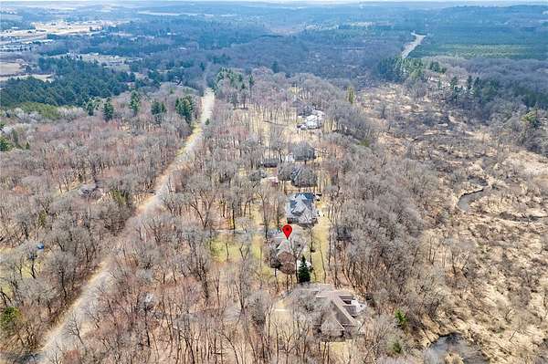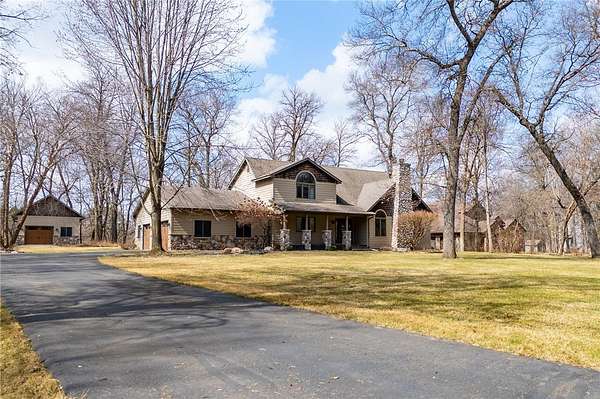 Just south of Eau Claire this immaculate one owner home features 3 bedrooms, 3 full baths, 3 car heated attached garage plus a detached garage with a loft all on 2.62 wooded acres AND owned Lowes Creek frontage. Main level: includes 2 bedrooms, main floor laundry, full bath, spacious kitchen with Island, sunroom with gas fireplace off dining and a 2 story living room with wood burning fireplace. Upper level: You'll find the owner's en suite complete with walk in closet, private bath with shower, jacuzzi and double vanity. You'll also enjoy the loft/en suite den overlooking the grand living room and fireplace. Lower level has a family room with built-ins, fireplace, full bath and bonus room. Need more room? finish off the 736 sq ft to suite your needs. Granite tops in kitchen, quartz in bathrooms. Also included: in ground sprinklers, inside/outside sound system and stamped concrete patio with large wood burning fireplace. New Roof by Rock and Tait summer 2025!