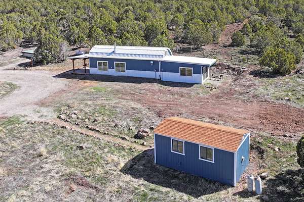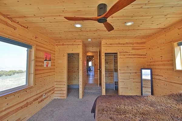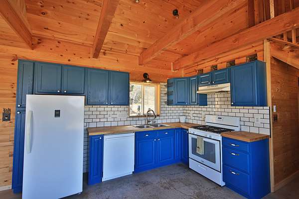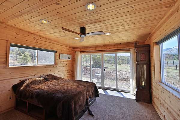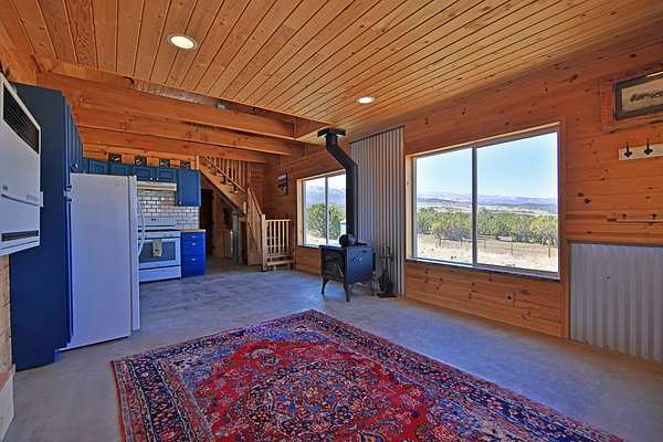The large graveled drive leads down past the 2,100 sq ft shop to the cute and cozy 840 sq ft custom energy efficient home with one primary bedroom and one loft bedroom. An additional heated and powered guest cabin expands sleeping quartersThe main living space features vaulted ceilings with custom pine tongue and groove walls and open concept living. Large double bay windows look out over the Grand Mesa giving this home views you'll never tire of.The kitchen has a butcher block countertop, new dishwasher, refrigerator, gas range and chest freezer. The full bath includes a deep soak claw tub with shower and vanity. Laundry room area includes a full-size stackable washer and dryer. Step down into a spacious master bedroom with dual walk-in closets. Enjoy the gorgeous views out of the bedroom with the 10 foot wide double sliding glass door providing access to the outside sitting area. Wood stove, wall propane heat, instant hot water heater, concrete/ carpet flooring, recessed lighting, and ceiling fans create efficiency and ease in a country lifestyle.