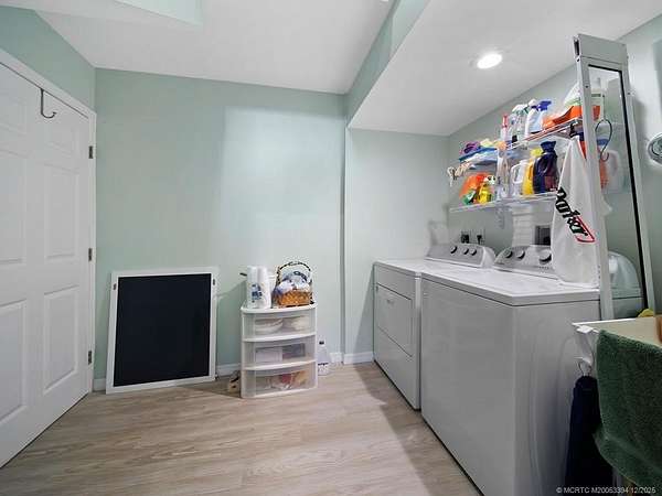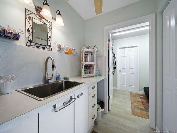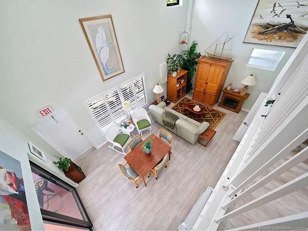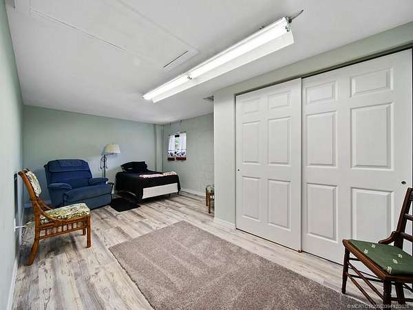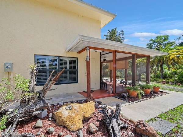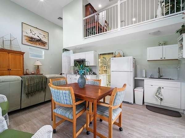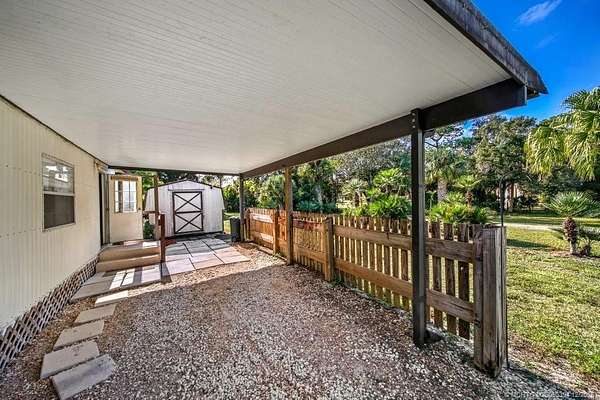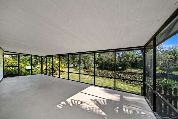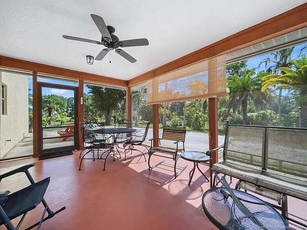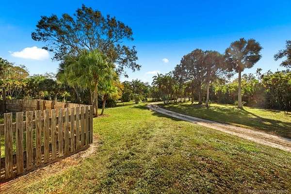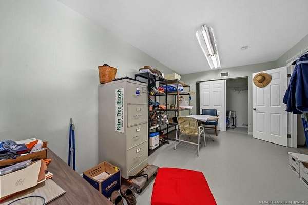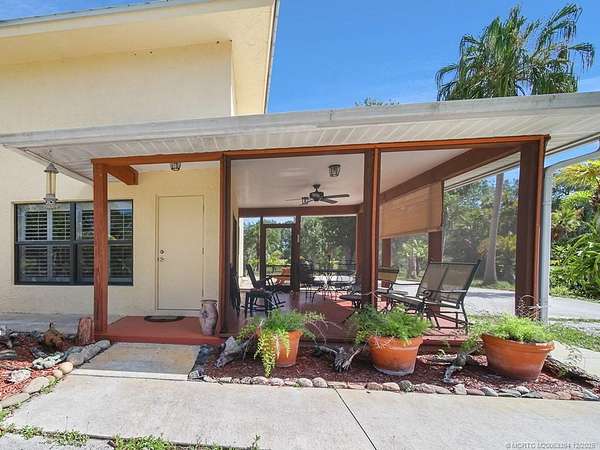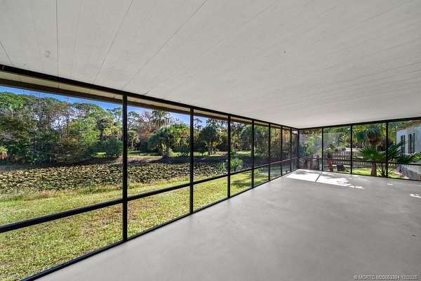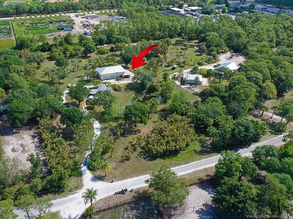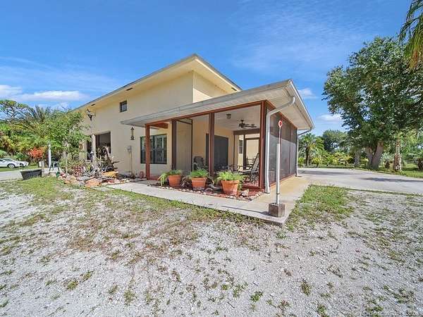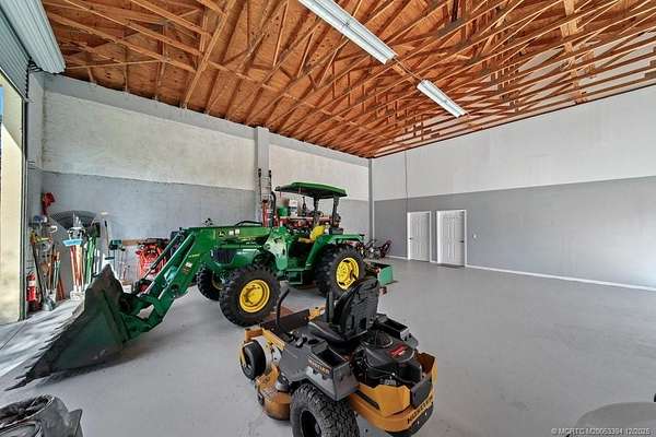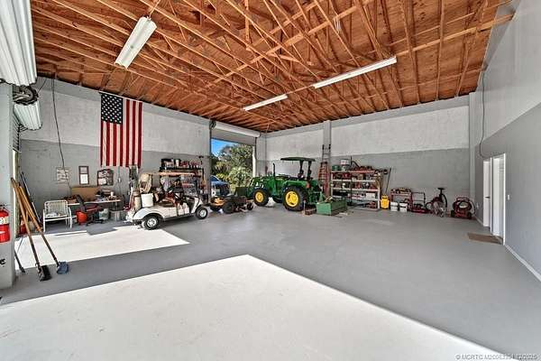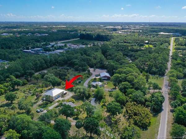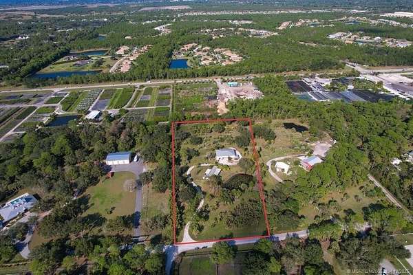 Palm City Farms - Unique multi use opportunity! Approx. 5 acre with scenic pond, 40 x 60 Concrete block garage with 1-2 bedroom, 2.5 bath apartment. Built in 2002, garage has 16' ceiling with 3 roll up steel doors (1 = 9 x 14, 1 = 9 x 16, 1 = 9 x 9). Huge space, with metal roof, perfect for Farm Equipment/Cars/RV's/Boat/Workshop/storage... In 2022 part of building (approx. 1230 SF) was converted into Coastal Chic furnished apartment (Barndominium) with comfortable & efficient combination of living, dining & cooking areas. Currently set up with loft bedroom & office/storage/laundry on main (convertible to master on 1st floor) complete impact glass windows and sliders, screened porch that opens to concrete RV pad with dump station, 50-amp hookup & water plus drive around area for more boat, RV storage. Also on property is a 14 x 70' 2-bedroom modular home with carport, screened porch, shed & separate septic. Could be rented or removed to build SF home. High & Dry. Opportunity abounds!