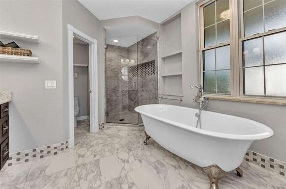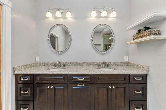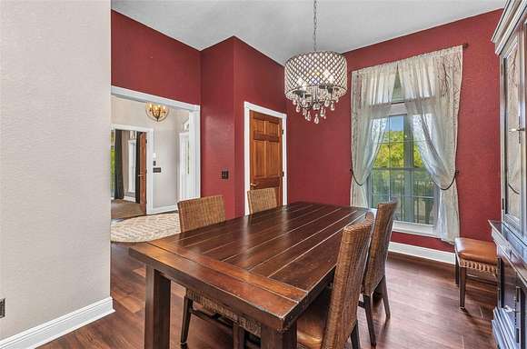 - Built-In Features, Central Vaccum, Crown Molding, Eat-In Kitchen, High Ceilings, Living Room/Dining Room Combo, Primary Bedroom Main Floor, Solid Surface Counters, Solid Wood Cabinets, Split Bedroom, Thermostat, Walk-In Closet(s), Wet Bar, Window Treatments