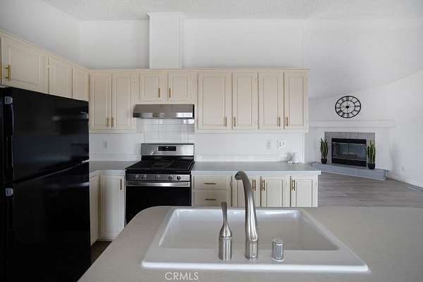The living room features a wood-burning fireplace and ceiling fan, with an open layout connecting to the dining area and kitchen. Kitchen includes a propane range, refrigerator, pantry, kitchen island, and ample cabinetry.