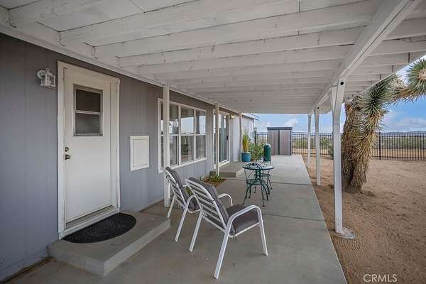 Exterior features include concrete surrounding the home, covered patio area, and full chain-link fencing around the 5-acre parcel. Enjoy expansive desert, mountain, and panoramic views.