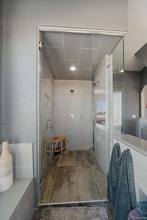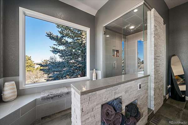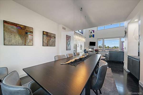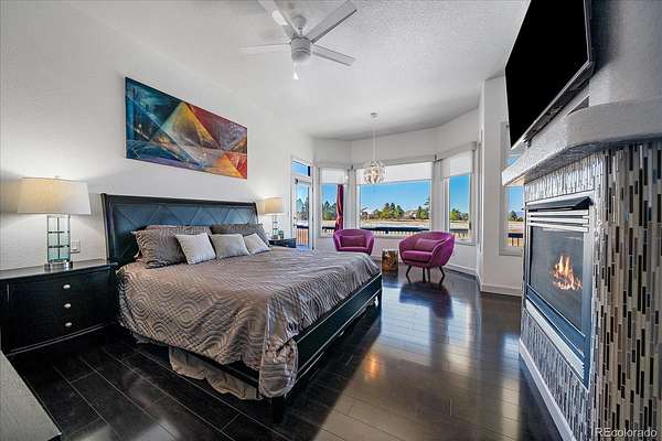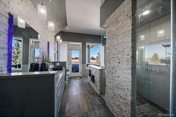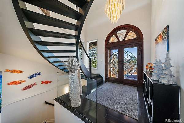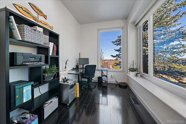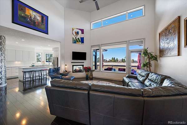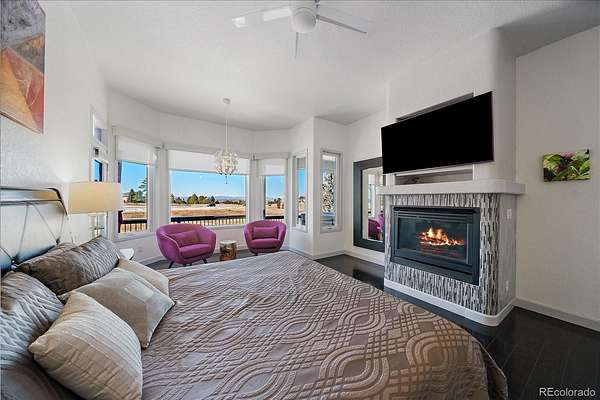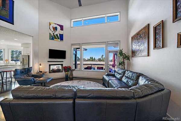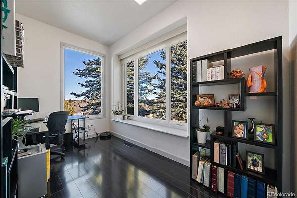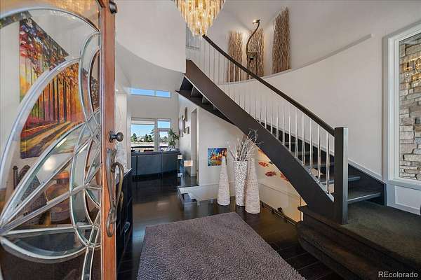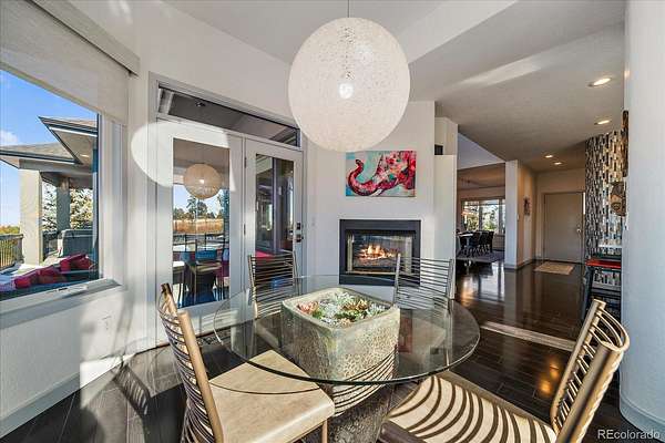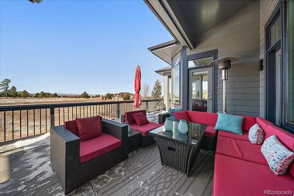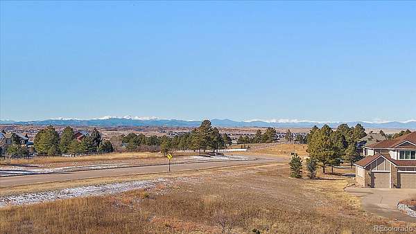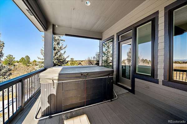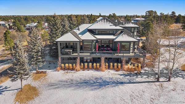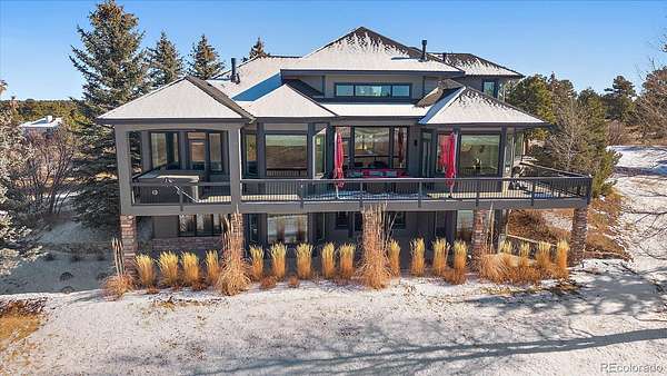Want to enjoy Colorado to its fullest? This beautiful 4631-square foot, 4-bedroom, 3.5 bath contemporary home sits on 1.67 acres tucked into an oversized cul-de-sac, framed by towering Ponderosa pines, spruce, aspen, and maple trees and native as well as professional landscaping. The home sits at 6776 feet in elevation and the view of the Colorado mountains is spectacular, from Pikes Peak to Mount Blue Sky and further up the front range. Enter this home through the custom-made leaded glass front doors and be greeted by soaring vaulted ceilings and numerous large custom windows that flood the home with natural light and allow for breathtaking mountain views from almost every room in the home, as well as views of Bingham Lake to the north. The kitchen is the heart of the home with upgraded stainless steel appliances, quartz counters, and a stylish tile accent wall. The kitchen is open to the large family and dining room areas, as well as a separate kitchen nook, creating a generous open space perfect for casual living and easy entertaining. The primary suite is large and includes a separate but easily accessible office space, a beautifully tiled fireplace, and a custom, spa-like bathroom complete with heated floors and easy access to the hot tub just one step outside the primary bathroom, on a deck that spans the entire length of the home. Upstairs is a generously sized loft/library and a very private secondary bedroom and en-suite bath. The walk-out basement (yes, you can see the mountains from rooms in the basement!) has a wet bar, an expansive game room for family and friends fun, two additional bedrooms, a full bath, and the perfect space for a future wine cellar. An easily accessible cart path in the neighborhood leads to the Pinery Country Club’s 6th hole (out of 27) and it’s a straight shot to the Pinery club house. The golf cart is negotiable!
