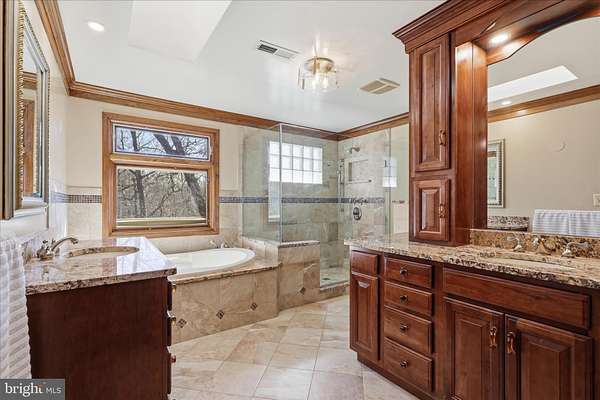 - Attic, Breakfast Area, Built-Ins, Ceiling Fan(s), Crown Moldings, Dining Area, Entry Level Bedroom, Formal/Separate Dining Room, Gourmet Kitchen, Island Kitchen, Jetted Tub Bathroom, Open Floor Plan, Pantry, Primary Bath(s), Recessed Lighting, Skylight(s), Tub Shower Bathroom, Upgraded Countertops, Walk-In Closet(s), Walk-In Shower Bathroom, Water Treat System, Window Treatments, Wine Storage, Wood Floors