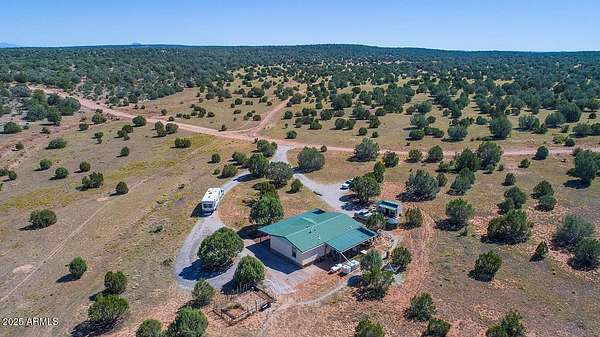 Peaceful desert living on nearly 4 acres! Charming 3 bed / 2 bath manufactured home built in 2000 with covered front porch, open kitchen/dining area and wide southwestern views. Set back on a private dirt drive with scattered juniper and pinon, this property offers room for hobbies, RVs, or a small workshop. Perfect for buyers seeking a low-traffic, rural retreat just outside historic Seligman and the Route 66 attractions
