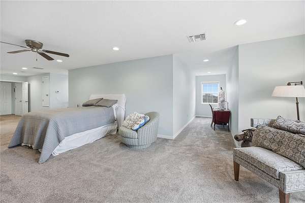 - Ceiling Fans(s), Crown Molding, Dry Bar, High Ceilings, Kitchen/Family Room Combo, Living Room/Dining Room Combo, Open Floorplan, Primary Bedroom Main Floor, Primary Bedroom Upstairs, Stone Counters, Thermostat, Walk-In Closet(s), Window Treatments