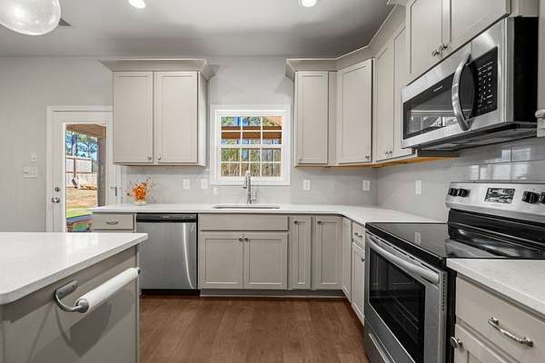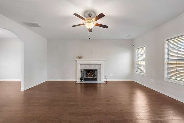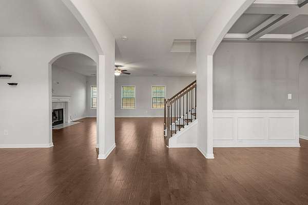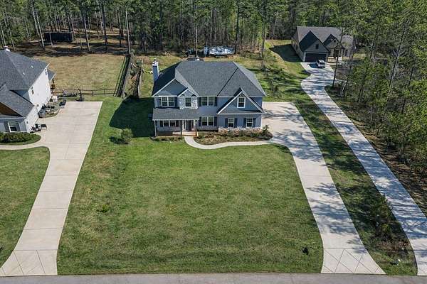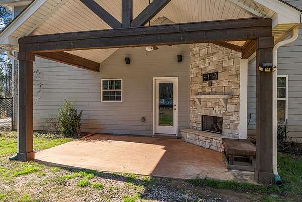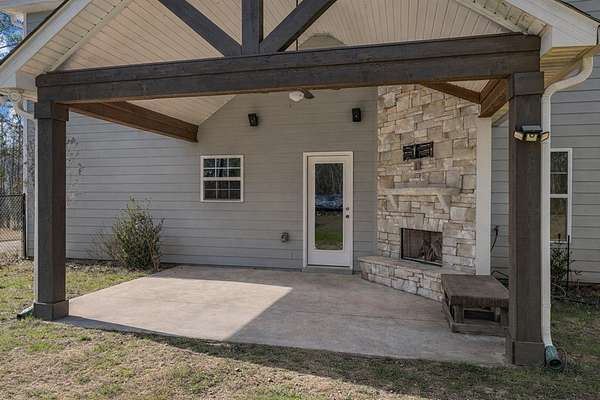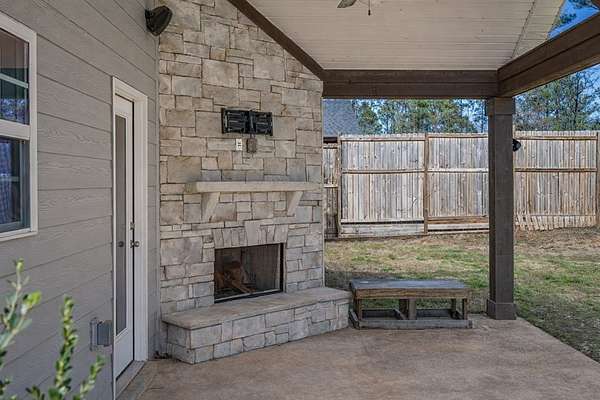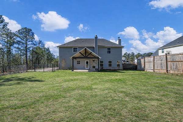 Beautifully maintained 4-bedroom, 2.5-bath home offering thoughtful design and exceptional living spaces throughout. The main level features an inviting entry foyer, hardwood floors throughout, a separate dining room with coffered ceiling and wainscoting, a separate den, and a spacious living room with a wood-burning fireplace that opens seamlessly to the kitchen-perfect for gathering with family and friends. The kitchen is well appointed with stainless steel appliances, quartz countertops, a large island, and an oversized pantry, ideal for entertaining, everyday meals, and weekend BBQs. A convenient half bath and built-in cubby area for coats and shoes add everyday functionality, along with a two-car garage. Enjoy quiet mornings sipping coffee on the covered front porch or relaxing on the covered game day porch with a wood-burning fireplace overlooking a large, flat backyard with fencing, plus additional yard space extending into the wooded area beyond-perfect for play, pets, and outdoor gatherings. Upstairs, all bedrooms feature vaulted ceilings, including a generous owner's suite with an electric fireplace, two extra large closets, and a spa-like bath with dual vanities, quartz countertops, soaking garden tub, and tiled shower. All upstairs bathrooms and the oversized laundry room feature tile flooring. Blinds remain, underground utilities add curb appeal, and the home-only five years old-has been exceptionally well kept, offering comfort, style, and move-in-ready convenience.