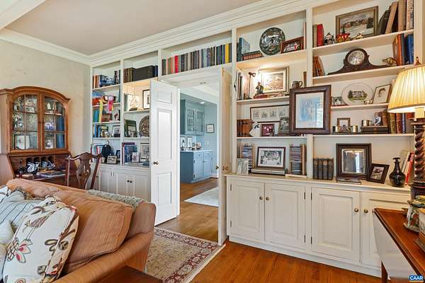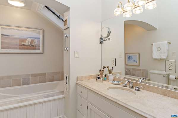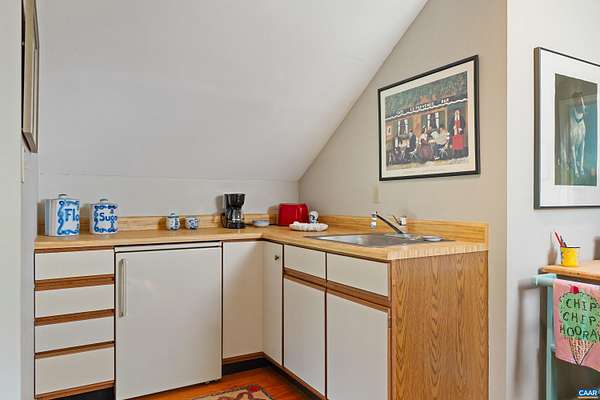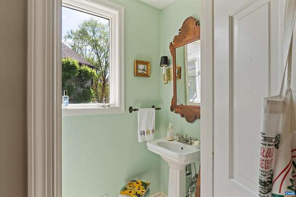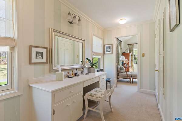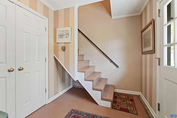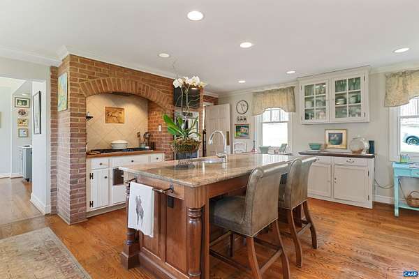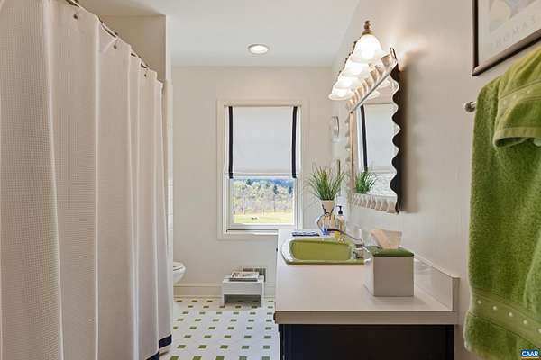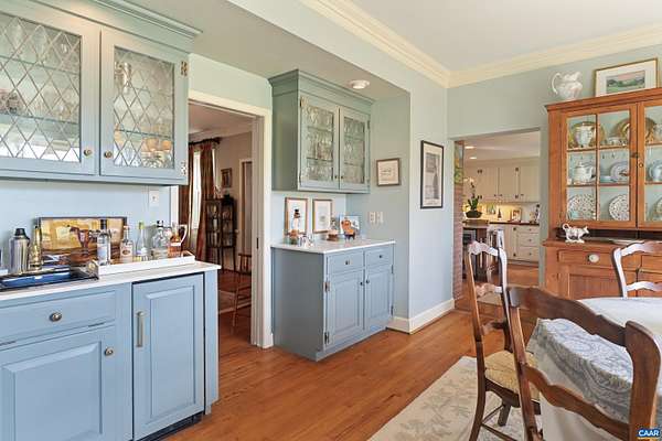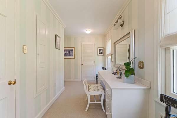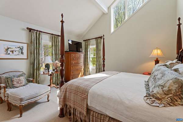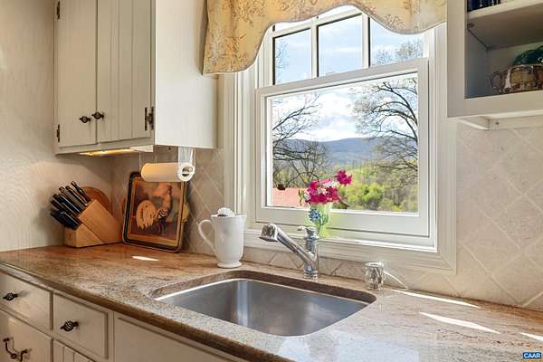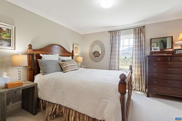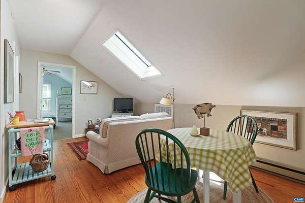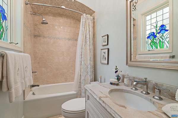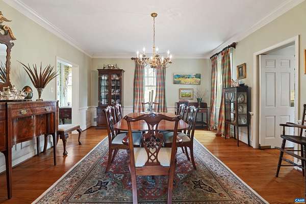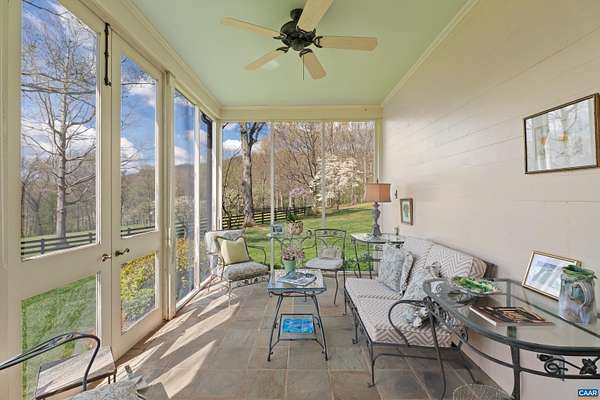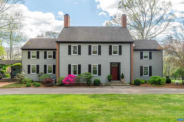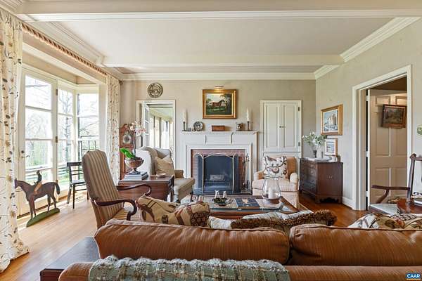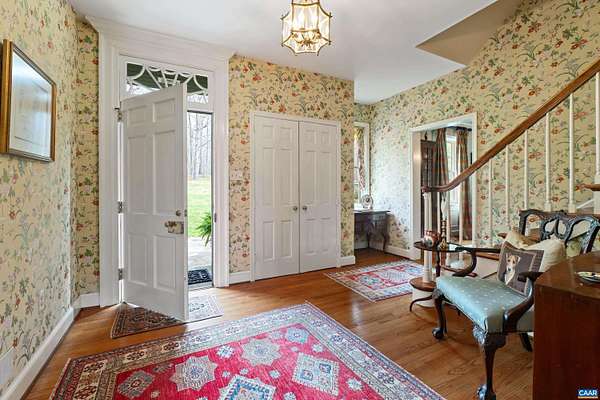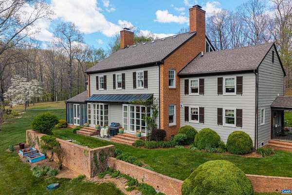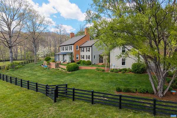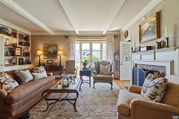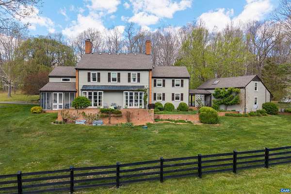 Designed by Virginia architect Thomas W. S. Craven and set on 65.73± private acres in the mountains of Hot Springs, this five-bedroom farmhouse estate is offered for the first time in a generation. Just 10 miles from the Omni Homestead Resort, the setting is as private as it is well-positioned. The main house (5 BR / 3.5 BA) reflects Craven’s attention to finish and proportion: Venetian plaster walls, crown moldings, soaring 20-foot ceilings in the upstairs primary suite, and two fireplaces anchoring the entertaining rooms. A renovated kitchen opens to a morning room with mountain views. A screened porch, slate breezeway, and formal rear gardens complete a home that lives well in every season. The first-floor primary suite offers screened-porch access and a full bath. Upstairs, a second primary retreat features 20-foot ceilings, a dressing area, two walk-ins, and a private bath. Three additional bedrooms and a corner study round out the upper floor. Above the attached garage, a self-contained apartment with one bedroom, kitchenette, and full bath offers flexible accommodations for guests or staff. A four-stall barn, fenced pastures, and wooded trails complete the offering.