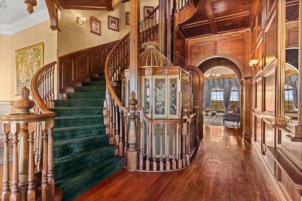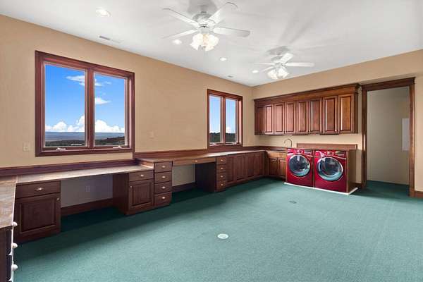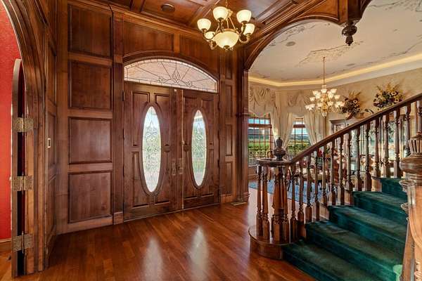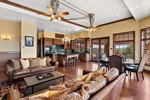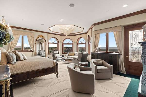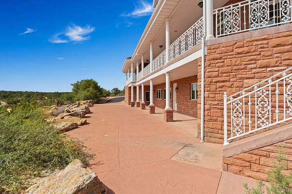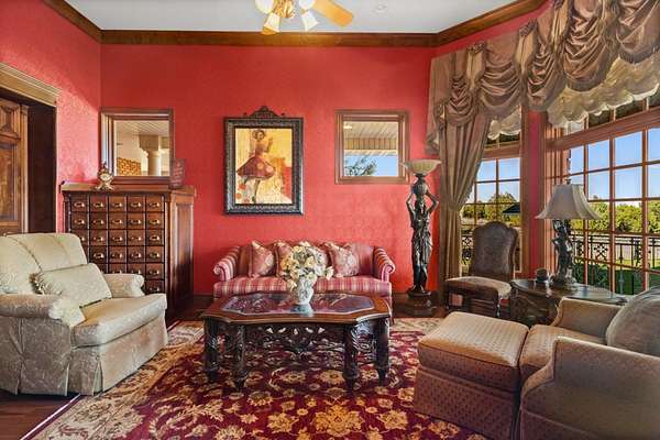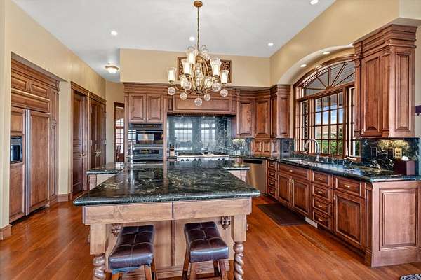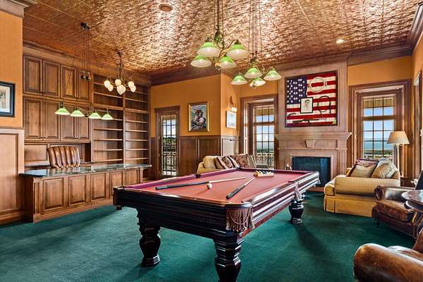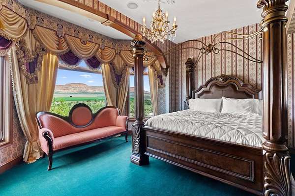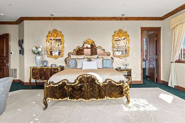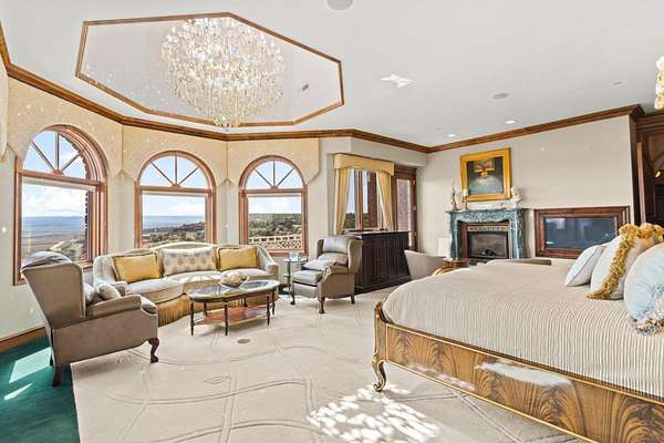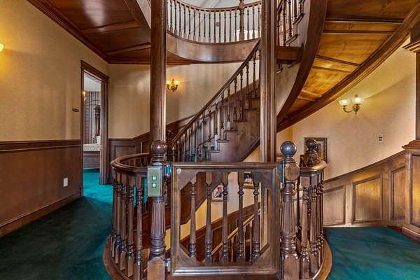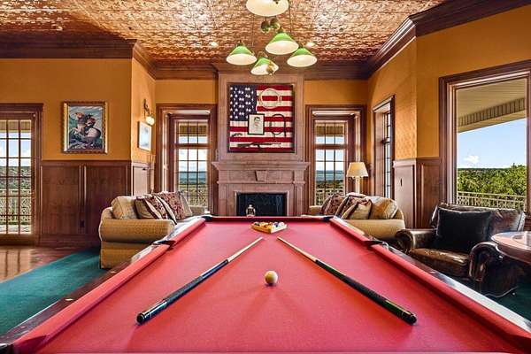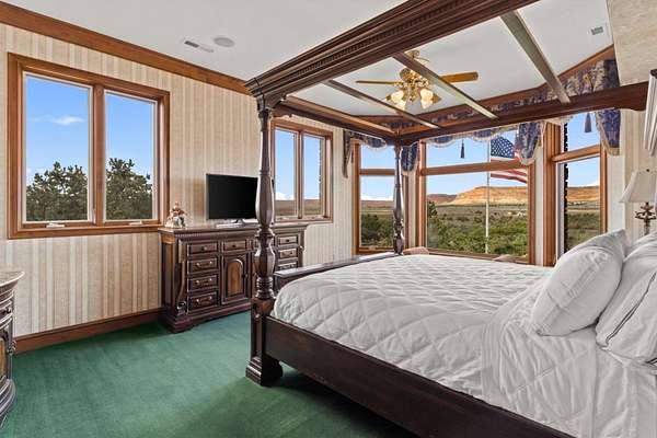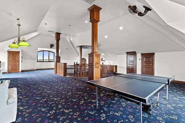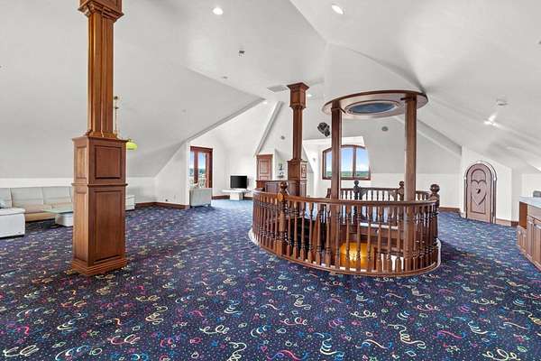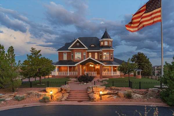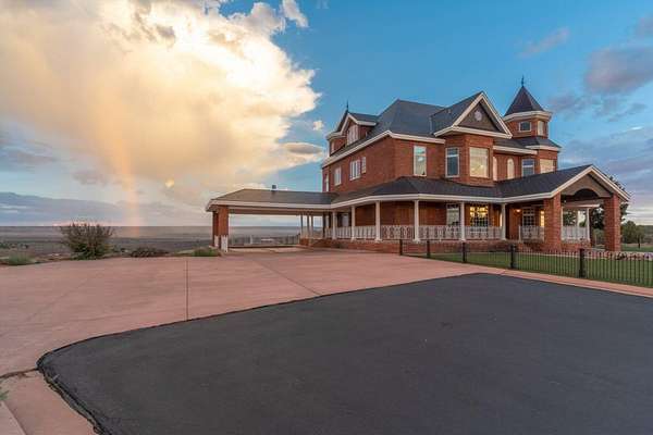 Set behind a grand gated entrance and surrounded by sweeping 360-degree views, this extraordinary Victorian Ranch estate spans two parcels totaling 40 acres, offering a rare blend of timeless architecture, privacy, and versatility. With 11,420 square feet of living space, the property is ideally suited as a luxury private residence, boutique bed & breakfast, corporate retreat, or unforgettable family compound. Built with enduring materials including brick, stone, and a striking copper-patina metal roof, the home combines classic character with modern comfort. Inside, soaring 12-foot ceilings (vaulting to 13 feet), elegant arched doorways, and expansive windows fill the home with natural light while framing the surrounding landscape. The heart of the home features a spacious gourmet kitchen with walk-in pantry, fireplace, and abundant storage, opening to inviting gathering spaces designed for entertaining. A dedicated home theatre with stadium seating and surround sound creates the perfect cinematic experience. The residence offers five bedrooms, two executive offices, and a whimsical third-story loft designed as a children's flex space with its own bathroom, sink, and Juliet balcony. The primary suite serves as a private retreat with fireplace, chandelier, spa-inspired bath with jetted tub, multi-head shower, dual vanities, and a large walk-in closet with integrated home gym. Additional flexibility is provided by two distinctive office spaces--one fully furnished with private bath and elevator access, and another with coffered ceiling, gas fireplace, and billiards area. The lower level functions as a private apartment with second kitchen, living room, laundry, additional bedrooms, and ample storage. Comfort and convenience are enhanced with radiant heat, five-zone HVAC, central vacuum, dumbwaiter to the pantry, Savant lighting, Sonos sound system, Nest thermostats, security cameras, and extensive built-in storage. Outdoor amenities include a wraparound deck, resurfaced driveway, 50-foot flagpole, irrigation system, water feature, and a private outdoor shooting area with a natural earthen berm providing a substantial backstop for target practice. For hobbyists or collectors, the property features a large insulated aluminum shop/RV garage with 220 power, heaters, and multiple windows--ideal for vehicles, recreational equipment, or workspace--along with a covered two-car carport beside the main home. Utilities include a 1,000-gallon propane tank, updated water heaters, water softener, newly replaced water main, septic system, and paved road access. Opportunities like this are exceptionally rare--a grand estate offering remarkable scale, privacy, and flexibility in an unforgettable setting.