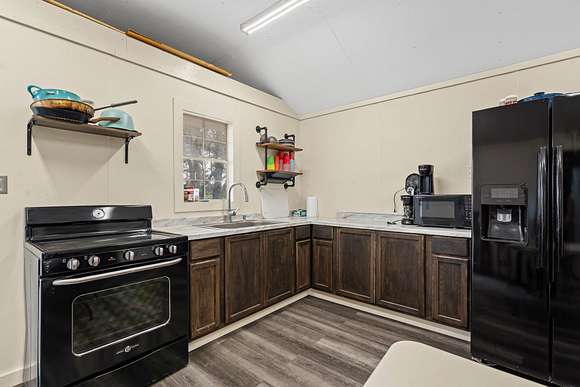 The ranch features two rustic cabins that currently serve as a hunting camp, providing comfortable accommodations for weekend stays or seasonal use. Co-op water supplies the cabins and there is the option of moving the water meter along the road frontage if desired. Additional infrastructure includes a covered pole barn for equipment storage, several stock ponds, and a caliche pit used for road base material. A water well is located near the pole barn and is currently being utilized for livestock purposes. A 5-acre lake has been started but will require further sealing work to retain water.