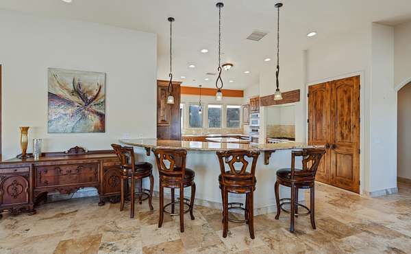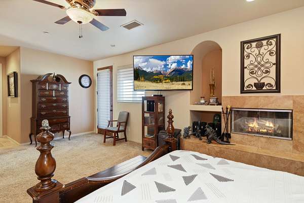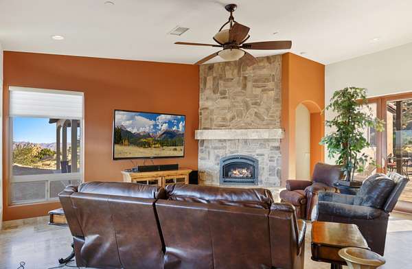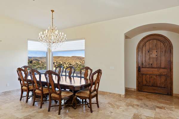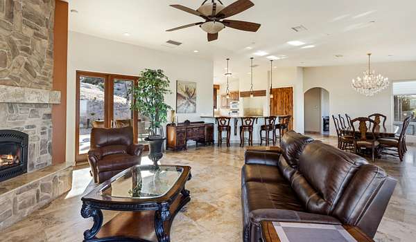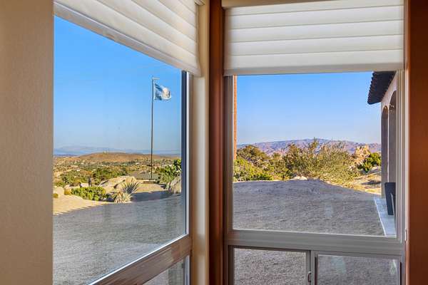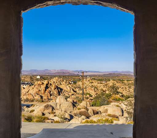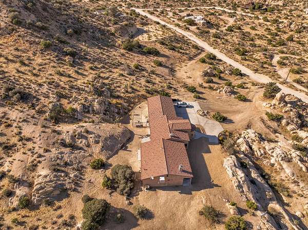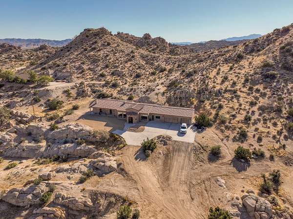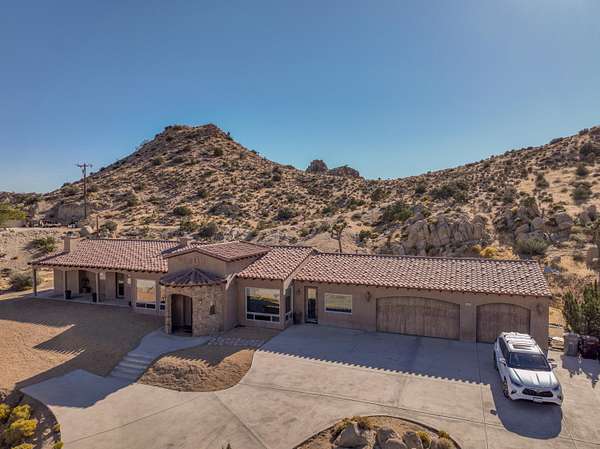 Stunning inside and out, this remarkable desert retreat offers the perfect blend of privacy, beauty, and comfort. Situated on over two acres, this nearly 3,000 square foot home features 3 bedrooms, 3 bathrooms, and breathtaking views highlighted by magnificent climbing boulders that create a truly unforgettable setting. A dramatic towered entrance welcomes you into the home, complemented by a spacious 4-car garage. Inside, the expansive open-concept living, dining, and kitchen areas are designed for both relaxed living and effortless entertaining. The chef's kitchen is a standout, featuring a professional-style built-in range and hood, abundant custom cabinetry, golden granite countertops, and beautiful travertine flooring that adds warmth and elegance throughout the space. Two spacious primary suites each include private bathrooms and convenient outdoor access, offering flexibility for guests or multi-generational living. The main primary suite provides an added touch of luxury with fireplaces in both the bedroom and the spa-like bathroom. Additional highlights include a dedicated office that could easily serve as a fourth bedroom, a full hall bathroom, interior laundry, and a large patio perfect for enjoying the surrounding natural beauty. This exceptional home offers a rare opportunity to own a peaceful desert sanctuary with unforgettable views and distinctive character.