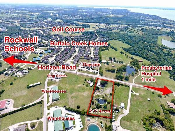 PRIME PROPERTY ON THE BUSY HORIZON ROAD. 2.17 ACRES. There is a structure on this property that was used for residential purposes; contact the city in regard to commercial zoning. It is zoned C2 currently. Tear it down or remodel it. Being Sold for Land Value. PERFECT FOR MEDICAL, RETAIL, DENTAL, OFFICE, SCHOOL... Don't miss this prime commercial acreage. 193 ft. frontage on Horizon Road (FM 3097) in Rockwall. Water, electric, pond, and septic on this property. Easy Access to I-30. 1 mile or less to Presbyterian Hospital and Rockwall Schools. The value is in the land. Please verify all information. Let's get this property sold! Development next door begins soon.