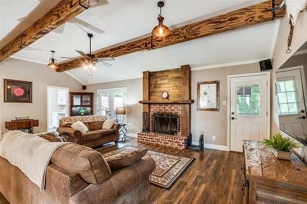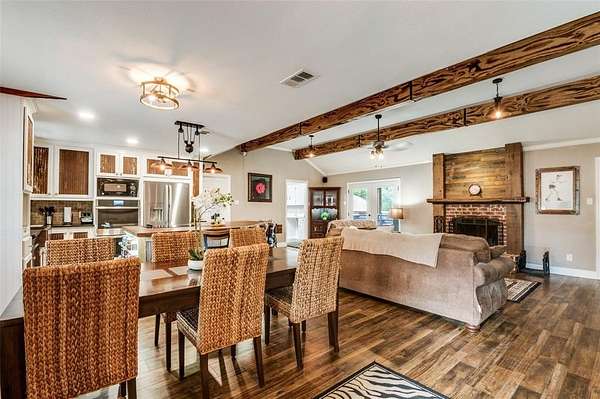 Welcome to your dream retreat: a charming three-bedroom, two-bath home nestled on more than an acre and a half of peaceful land. Step inside and discover a spacious open-concept layout that seamlessly connects the living, dining, and kitchen areas. The living room invites you in with ceilings featuring rustic wood beams, elegant lighting, and a cozy woodburning fireplace. The kitchen is a chef's delight, featuring a versatile island-breakfast bar, gleaming stainless steel appliances, granite countertops, a striking copper sink, and abundant storage. The primary suite offers a tranquil escape with wood-beamed ceilings, an ensuite bathroom, built-in storage, and a walk-in closet. Two additional bedrooms share a convenient bath, providing plenty of space for family or guests. The utility room has a built-in desk and overhead cabinets. Updates include new flooring in all three bedrooms and both bathrooms have been updated! Step outside to a sprawling 40x14 cedar-covered patio, complete with an outdoor kitchen, ample counter space, a sink, and grills--perfect for entertaining. Cool off in the above-ground pool with a deck, ideal for relaxing on warm summer days. Additional highlights include a two-car attached garage and a 24x24 powered shop that has AC and heat along with a woodburning stove plus an additional 24x15 powered and enclosed bay on the back. Experience the best of country living in this inviting home.