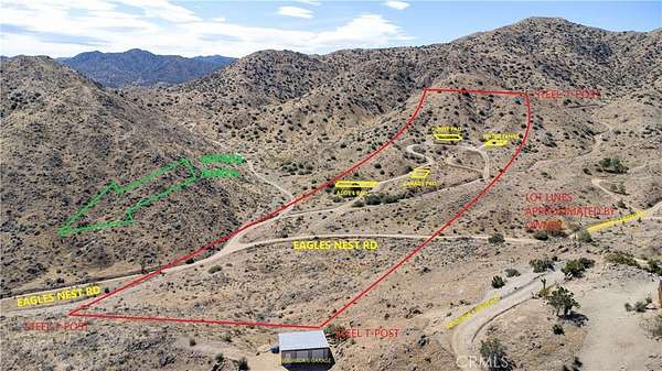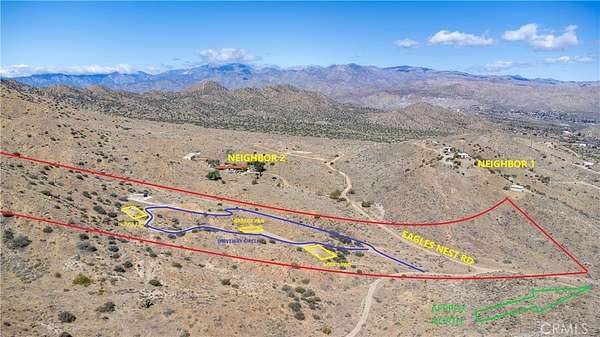 Welcome to your new high desert retreat at 56335 Eagles Nest RD in Yucca Valley! Start construction immediately with the fully permitted house and garage plans (see supplements for drawings). Set at ~4,000 FT elevation, these secluded 10 acres have only become available due to the Owners relocating out of state. Just a few minutes drive up a gravel road on the south side of Town, the (2) 5-acre adjoining parcels offer breathtaking views of downtown Yucca Valley and the San Gorgonio mountain range. Zoned RL-5 (residential), all the challenges of working through the design and permitting approval process have been completed for you! Owners have invested over $70k in architectural design, topographic survey, geo-technical engineering, structural engineering and civil engineering (see listing attachments for documents). Over $25k of grading and earthwork has also been completed in preparation for the new fully permitted 1,130SF 2BR 1BA house and 1,000 SF detached garage/shop. The approved project design may also incorporate a FULLY off-grid electrical system using solar, a propane backup generator, and lithium battery banks! The Owners designed the project with an emphasis on being completely OFF-GRID, and it is approved for a new private well (not yet drilled). The 1,400 FT long winding driveway loop leads you up to ~4,020 FT elevation, where the new 2BR 1BA house will provide unobstructed city and mountain views through the generous use of floor-to-ceiling glass doors and generously sized deck. Behind the house, the property continues to climb to nearly 4,100 FT elevation where the views are even more spectacular. Continuing along the driveway loop brings you to ~3,970 FT elevation, where the 3.5 car detached garage is set into the hillside for privacy, and offers 10FT ceilings, along with a dedicated electrical room and pad for the backup generator. The next stop on the driveway is a parking pad for addtl vehicles and an included 40FT shipping container for even more storage! Primary and secondary water storage systems have already been installed, and include (1) 2,500 gallon HDPE tank (potable) and (1) 20,000 gallon fabric reserve water tank (for dedicated fire protection). One of the Owners is a CA licensed RE Broker and General Contractor.......he is open to negotiating a construction contract with the new Owner, or move forward in the direction of your choice. This fabulous desert sanctuary can be yours now.....see it today - make an offer!