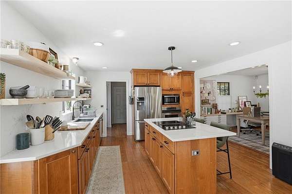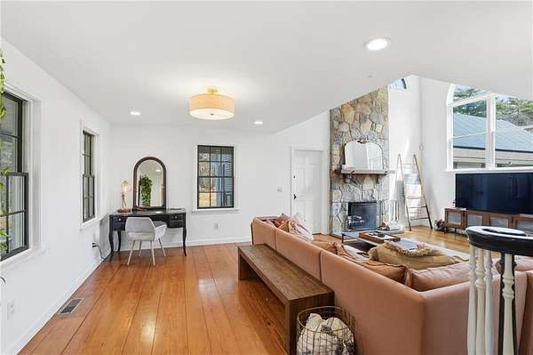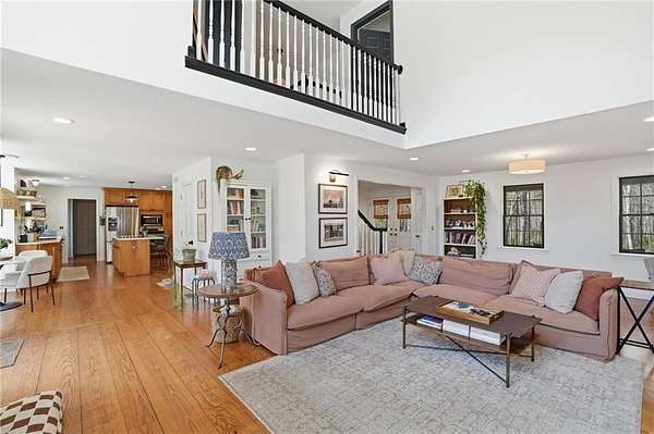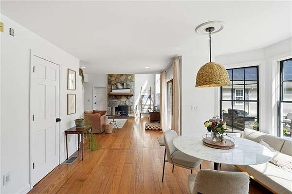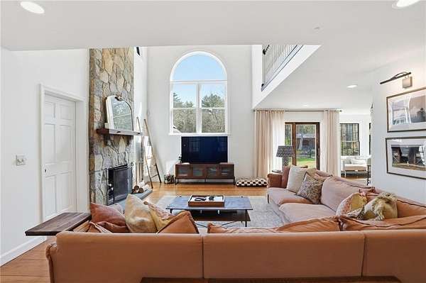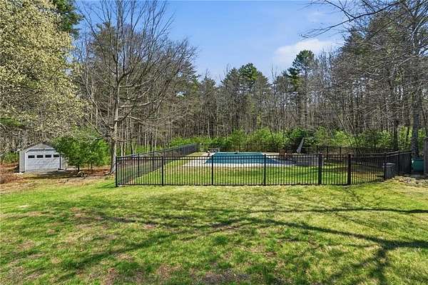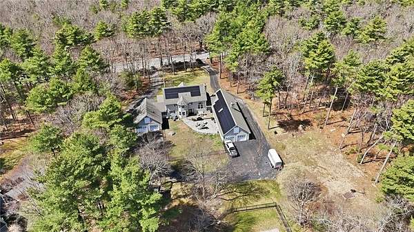 Multi generational living at its best.This fabulous, sun drenched home offers everything one could hope for.Starting with its convenient location, minutes from East Greenwich, Rt 95 and Rt 4, yet set back enough to provide just enough privacy.The lovely 2 acre lot borders miles of Big River Mgmt trails which can be enjoyed and accessed directly from the backyard.In this outdoor oasis you will also find a 20x40, fenced, in ground swimming pool and 3 outbuildings- a small barn with tack/storage room, a run in shed and a stand alone garage.There is a spacious, stamped concrete patio on which you can enjoy family get togethers or quiet nights.This fabulous home offers a generous, covered farmer's porch which adds to its warm, welcoming feel.That feeling continues as you enter through the double doors into the foyer of the home. The oversized, cathedral great room has a gorgeous, field stone fireplace, wide plank wood floors and a balcony.The main floor continues with an open flow to the kitchen, breakfast nook, powder room and dining room.On the 2nd floor you will find a master bed, walk in closet and master bath with shower and soaking tub as well as 2 additional beds and a bath.The lower level showcases a bar with a speak-easy vibe that will make you the envy of many.The spacious in-law has its own 2 car garage.The option to heat with oil or wood, new roof and solar rooftop panels add to the efficiency and appeal of this stellar property Subject to seller closing on PN property