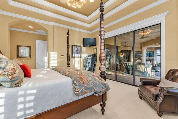Inside, Italian porcelain tile flows throughout an open, well-designed floor plan. Zero-corner sliders in the main living area showcase the pool, spa, water feature, and expansive views of the landscaped yard, pond, and fire-pit area equipped with lighting and speakers. The split layout provides a private primary wing with an ensuite bathroom and an executive office. Tray ceilings enhance the formal dining room, living room, den, great room, and primary suite.