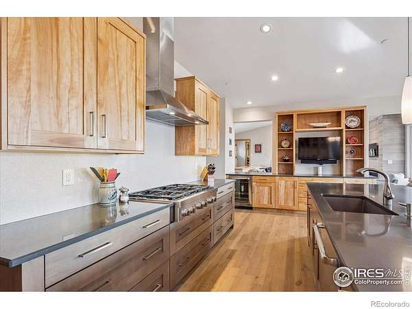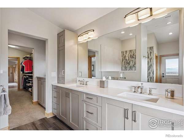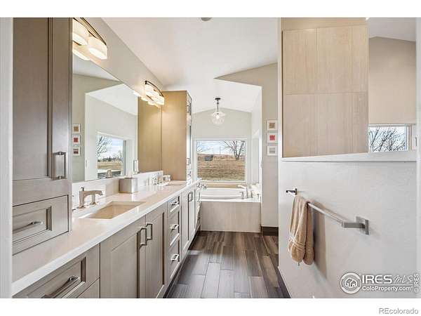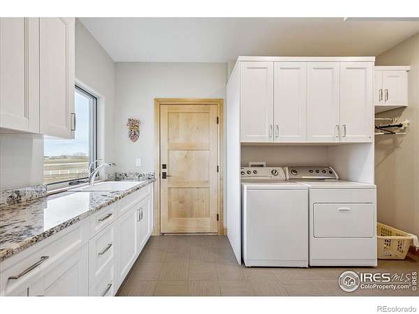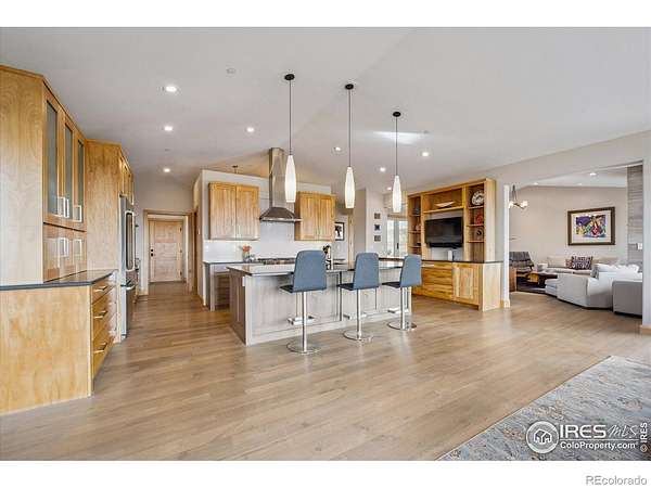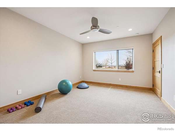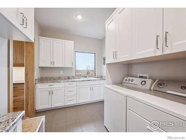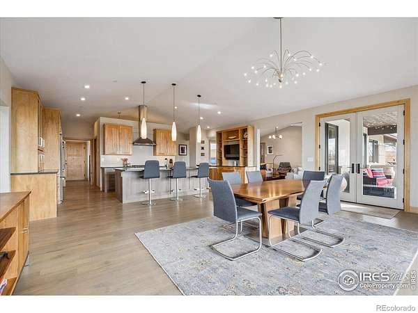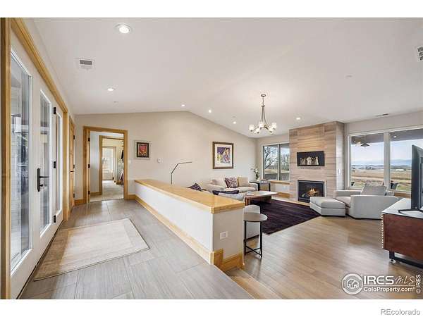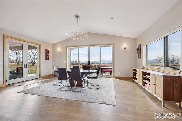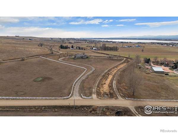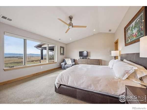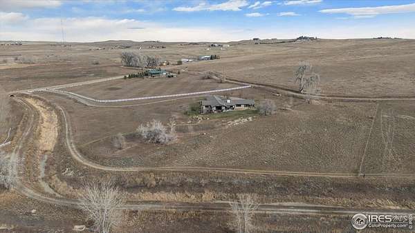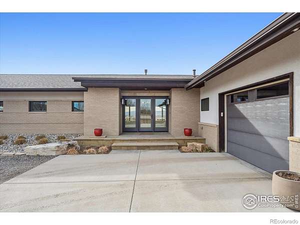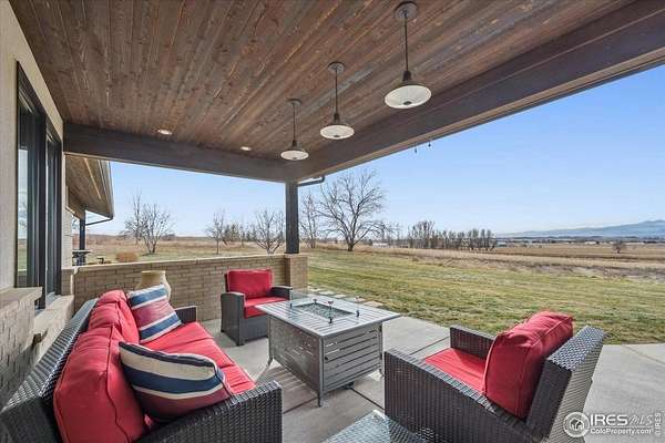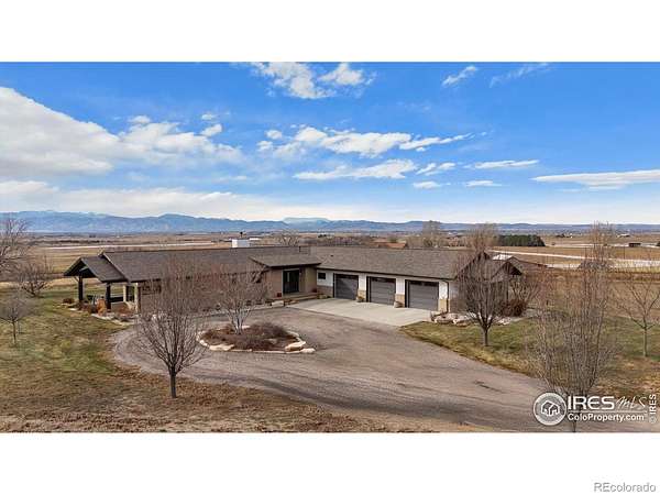 Experience exceptional Colorado living in this stunning custom ranch home set on 5 private acres with endless Front Range views. This 4-bedroom, 4-bath home offers 3,817 finished square feet and an open, contemporary layout designed for comfort and connection.The brick and stucco exterior hints at the quality inside. An inviting great room with gas fireplace flows easily to the dining room and gourmet kitchen. Natural white oak hardwood flooring spans the main level. The kitchen features a large island with seating, crushed-quartz countertops with space for a coffee bar, a Jenn-Air commercial-grade 6-burner gas range with stainless hood, Jenn-Air double ovens, Sharp drawer microwave, French door refrigerator, built-in beverage fridge, and a composition farm sink. A spacious walk-in pantry with functional shelving and baskets adds convenience. The main-floor laundry offers generous cabinetry and direct garage access.The primary ensuite showcases beautiful mountain views through perfectly placed windows. The 5-piece bath includes double quartz vanities, a soaking tub, and a large walk-in shower. Step directly from the suite to the private hot tub. A large walk-in closet connects seamlessly to both bedroom and bath. A secondary main-level ensuite bedroom sits on the opposite side of the home for added privacy.The daylight basement extends the living space with a large family room with gas fireplace, an additional ensuite guest bedroom, and a fourth bedroom with double walk-in closets. The oversized 1,172-sq-ft three-car garage provides ample room for vehicles, tools, and recreation gear.Outdoor living shines on the covered patio off the dining room, where you can enjoy dining, relaxation, and wide-open views. With 5 acres offering space and serenity just minutes from Fort Collins, this exceptional custom ranch home delivers luxury, privacy, and the true Colorado lifestyle.