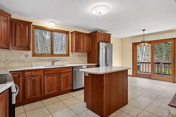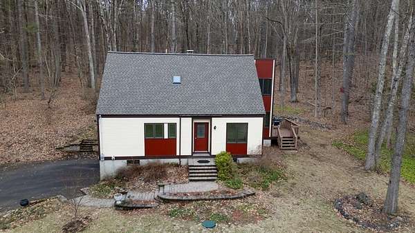A captivating contemporary cape presents itself as an inviting home ready for immediate occupancy. Within this distinctive residence, the living room offers an atmosphere defined by a high ceiling that gracefully ascends into the sunroom with skylight and a multitude of windows. while strategically placed skylight bathes the area in natural light, enhancing the warmth emanating from the fireplace. The dining room leads to the kitchen, a central area for culinary pursuits, with elegant stone countertops that provide a durable work surfaces, and also center island and dining area. This property encompasses three well-appointed bedrooms and two full bathrooms, providing comfortable accommodations. There is a 1st floor main bedroom with bath plus the large bedroom on second floor could serve as another primary bedroom. The 2nd floor also offers an office. The sylvan setting is complete with shed, gardens, and deck from kitchen. This dynamic home is conveniently sited for commuting!!