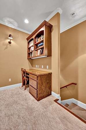The heart of the home features a chef's kitchen complete with stainless steel appliances, ample counter space, and a view that makes cooking a joy. An adjoining living space offers cozy evenings by the fireplace, while upstairs you'll find a dedicated home theater with built-in shelving, perfect for movie nights. Versatile workspaces, including a built-in office nook and exercise area, make it easy to blend work, play, and relaxation.