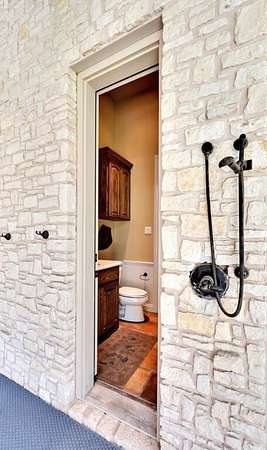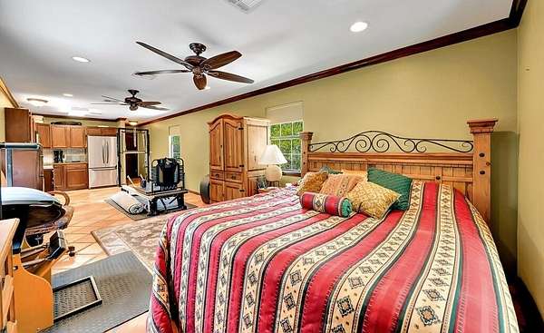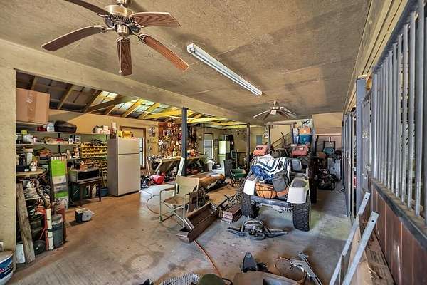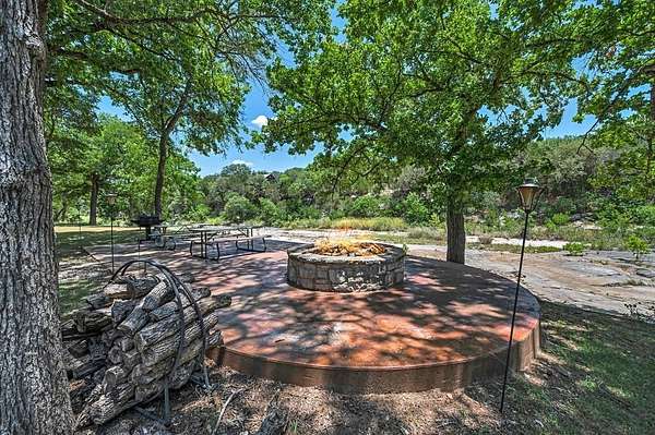 Beyond the pool, endless acres of open space and wooded trails lead to the scenic Childress Creek. Though wildlife strolls around the dwelling, the garden is fenced in to keep deer out. Equestrian enthusiasts will appreciate the well-equipped barn with ample storage, stalls, and a second-level liv
