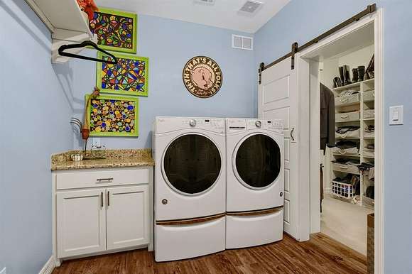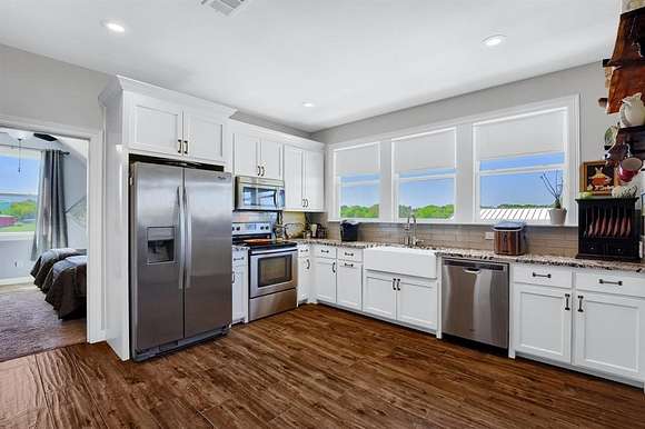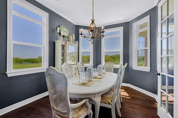 This custom home situated beautifully on 11 acres features peaceful country living, yet is close to shopping, restaurants, medical care, & Lake Texoma. Beautiful views of nature abound from every window. Highlights include granite counters throughout, double ovens, gas cooktop & pot filler with easy access cabinets. Full apartment (mother-in-law suite) features large bedroom, full kitchen, living area & bath, with 2 separate entrances. Stunning backyard oasis with a large travertine patio, low maintenance artificial turf, hot tub & pool that features swim jets, a large shallow play-lounge area. The spacious primary suite with spa-like bath, fireplace, & private deck with 180-degree views assures a perfect retreat for R&R. Updates since 2020: 36x40 workshop, pond, backyard oasis, all landscaping, new & improved cabinetry & storage, & MIL suite AC unit. Ten acres are AG exempt. Call for more details.