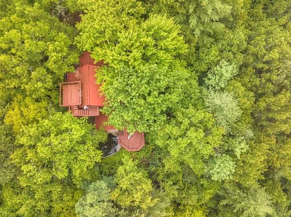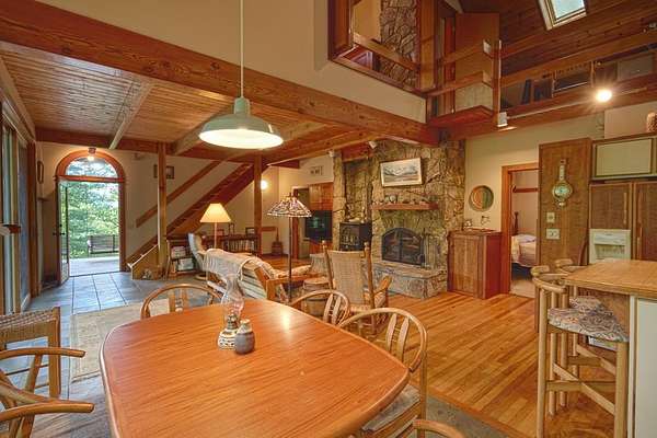 Tucked away in the trees, this custom home rests on 17.4 private acres with sweeping views that stretch from Queens Lake, across the Nantahala Gorge, and over the Lake Fontana basin. Designed and built under the guidance of renowned builder Bill Baxter, every detail reflects a thoughtful balance of comfort and design. Living here feels like being in the treetops, with glass along one wall and strategically placed windows that invite both light and mountain vistas. The open floor plan flows seamlessly from the main living space to the bedroom and office, anchored by a striking stone hearth with fireplace and wood stove.The master bath features a private sauna, and throughout the home you'll find custom stonework adding texture and character. Outdoor living is equally inviting, with a koi pond, stone terraced garden areas, and a deck inset designed for a wood-fired hot tub. Practical amenities include a ground-floor garage with an electric dumbwaiter for firewood, hydronic floor heating on the main level, and subtle access to a rooftop seating area with even broader views. Enjoy end-of-the-road privacy, direct proximity to Nantahala National Forest, and unlimited natural beauty.