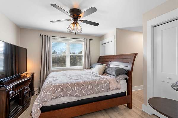 Retreat to the downstairs primary suite with abundant natural light, and unwind in the primary bathroom featuring modern lighting, double vanities, a soaking tub, and a separate shower. Upstairs offers two additional bedrooms, both with dual closets, plus a hallway full bath and open railing overlooking the living room.