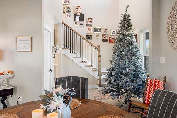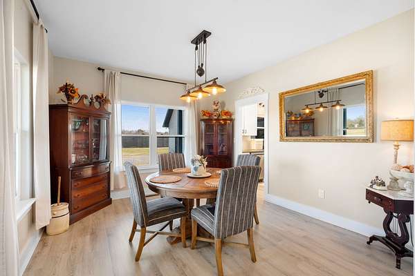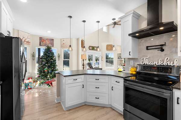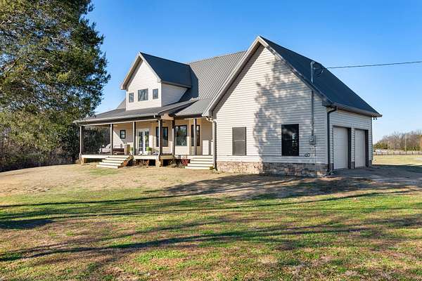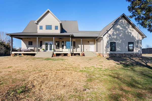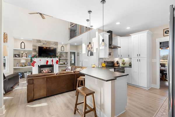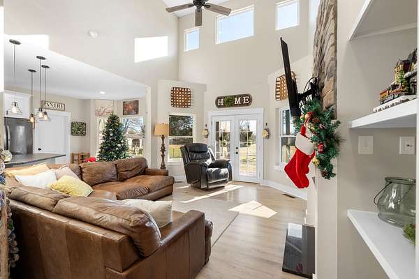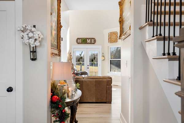 Enjoy country charm with a gravel driveway and a front exterior featuring a charming wraparound porch, perfect for relaxing and sipping your morning coffee. Step inside to a bright, inviting living area with hardwood floors, French doors, and a cozy gas/stone fireplace with built-ins.