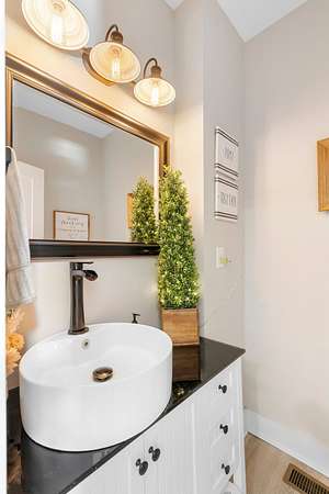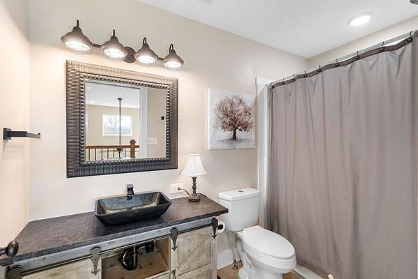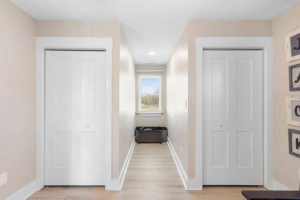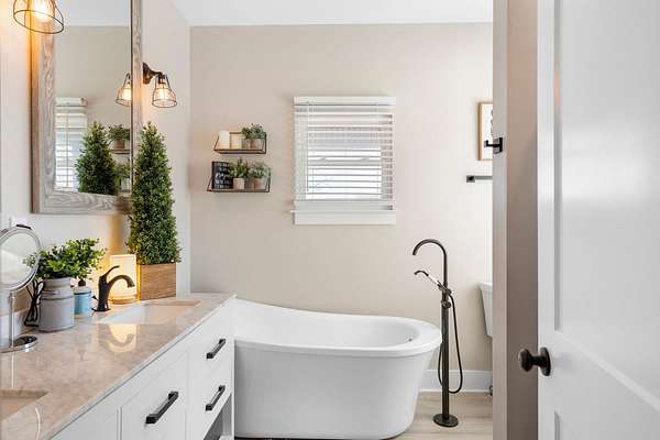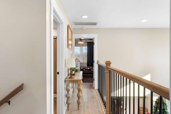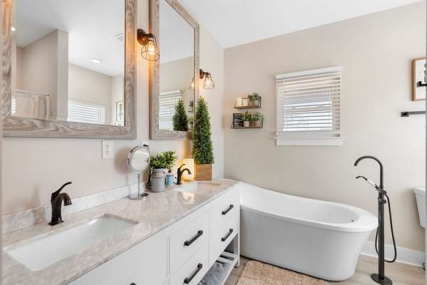 Retreat to the downstairs primary suite with abundant natural light, and unwind in the primary bathroom featuring modern lighting, double vanities, a soaking tub, and a separate shower. Upstairs offers two additional bedrooms, both with dual closets, plus a hallway full bath and open railing overlooking the living room.