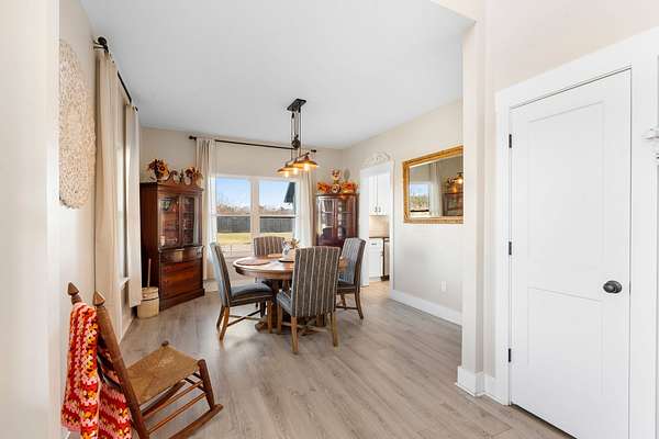The open kitchen boasts white cabinetry, a large island with built-in storage and seating, stylish tile backsplash, pendant and overhead accent lighting, stainless appliances, and convenient pantry access. Adjacent is a light-filled dining area in neutral tones, ideal for everyday meals or entertaining guests.