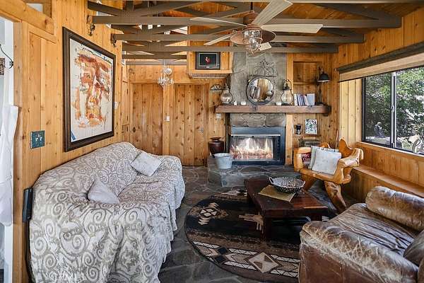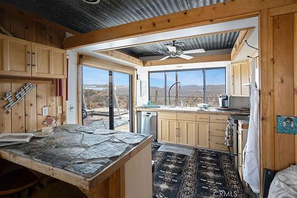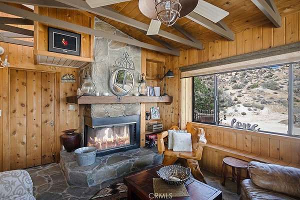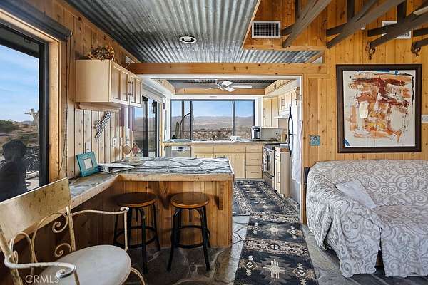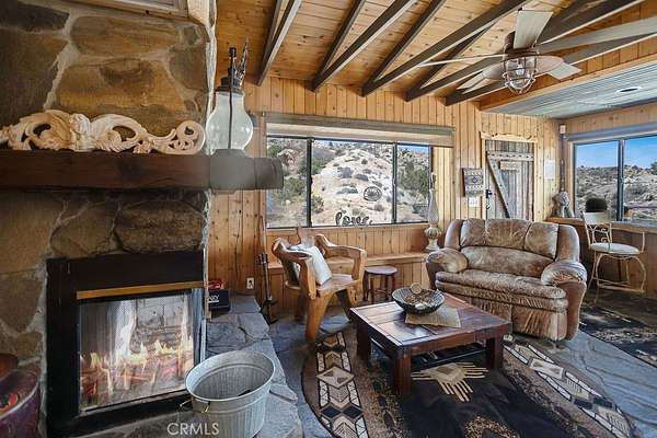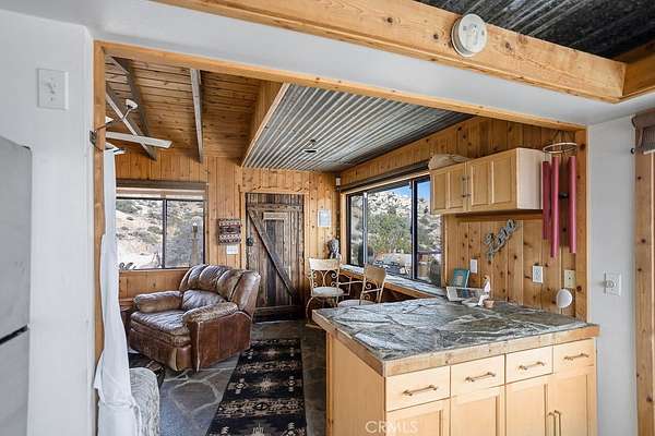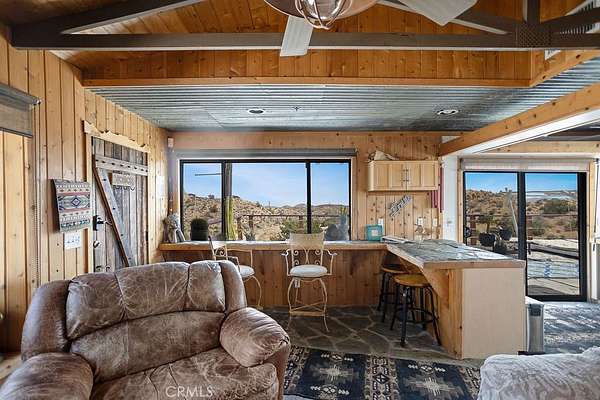 Stepping through the door of the main house, you’ll be taken aback by its unique style. The living area is accompanied by open beam and corrugated steel ceilings, beautiful rock flooring, knotty pine wood, and a gorgeous rustic rock fireplace that ties it all together. An abundance of windows positioned to take advantage of the phenomenal views provides a large amount of natural light, creating an open and airy feeling that flows throughout.