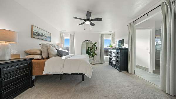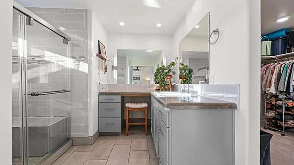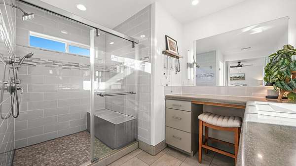 - Ceiling Fans, Main Level Primary, Pantry, Solid Surface Counters, Vaulted Ceilings, Walk In Closets, Walk In Shower, Window Treatments