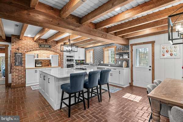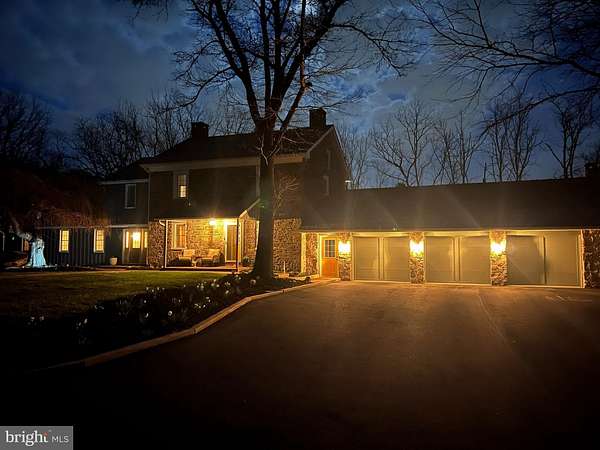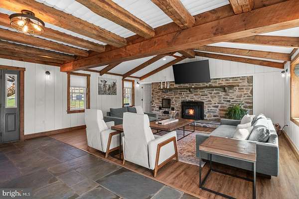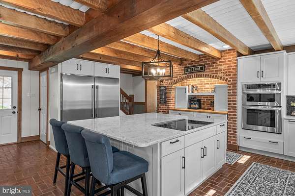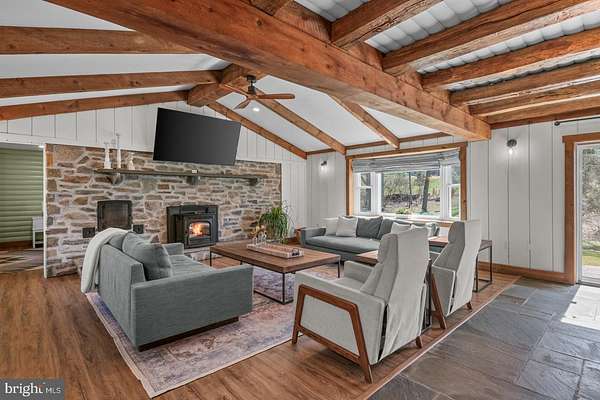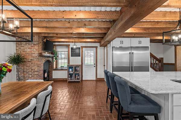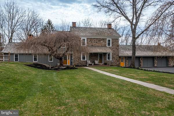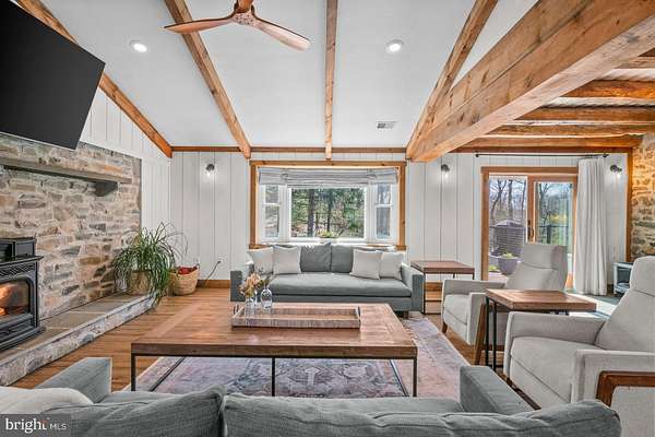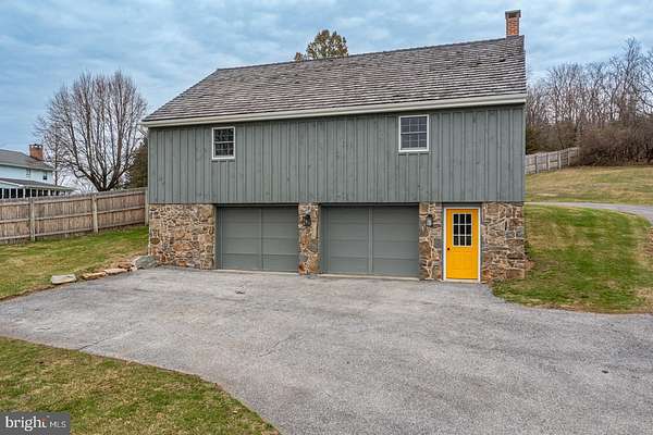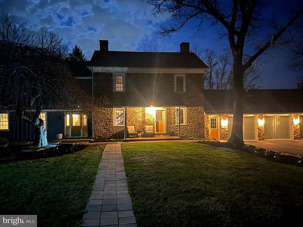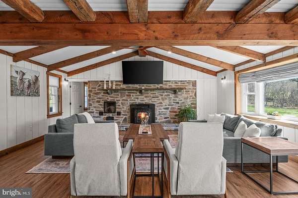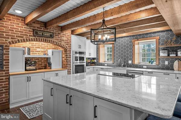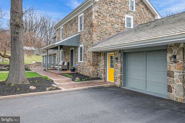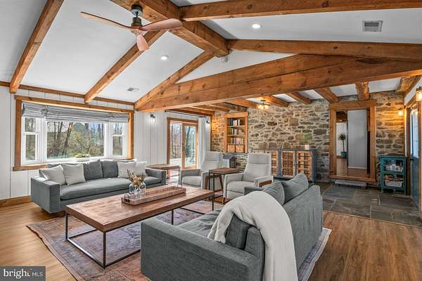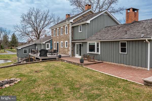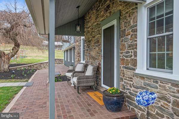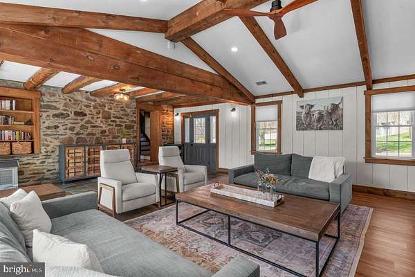 Experience refined country living in this stunning 2-story stone and wood-sided home, offering over 3,800 square feet of beautifully updated living space on 2.25 acres in the highly sought-after Plum Creek Estates. From the moment you arrive, the charming covered brick front porch welcomes you into an impressive foyer. Inside, the spacious living room showcases soaring cathedral ceilings with exposed beams, a striking stone accent wall with pellet stove, and a sun-filled bay window that creates a warm and inviting atmosphere. The heart of the home is the chef's kitchen, thoughtfully designed with quartz countertops, an oversized island with seating, a cooktop with downdraft, beverage fridge, and an eye-catching tile backsplash with open shelving. Architectural details abound, including a stunning brick arched wall with a built-in coffee bar and additional storage, brick flooring, deep window sills, and a second pellet stove-blending charm with modern functionality. Instant hot water adds everyday convenience. The main level also features a spacious dining area with outdoor access-perfect for entertaining-as well as a luxurious primary ensuite complete with a barn door entry, spa-like bathroom, tiled walk-in shower, and freestanding soaking tub. A well-equipped laundry room with ample storage and a powder room complete this floor. An additional versatile room currently used as a gym offers flexibility as a home office, playroom, or potential fifth bedroom. Upstairs, a second primary ensuite features custom board and batten detailing, built-in cabinetry, and a beautifully tiled shower. Two additional bedrooms and a full hall bath with storage provide plenty of space for family or guests. Step outside to enjoy the expansive property, complete with a 3-car attached garage, a large bank barn with an additional 2-car garage and a mechanic's pit, a picturesque pond with fountain, and a spacious Trex deck and brick patio ideal for outdoor living and entertaining. Additional upgrades include luxury vinyl plank flooring throughout most of the home, a security system with cameras, brand new generator, water softener, new windows, and an electric fence. There is a chicken coop, including the chickens and ducks! Enjoy the tranquility of country living while remaining conveniently close to Blue Marsh Recreation Area, major highways, shopping, and dining. This exceptional property offers the perfect blend of elegance, comfort, and functionality-ready to welcome you home. Note: Original farmhouse was built around 1880. Additions to structure were added during the 1980s.